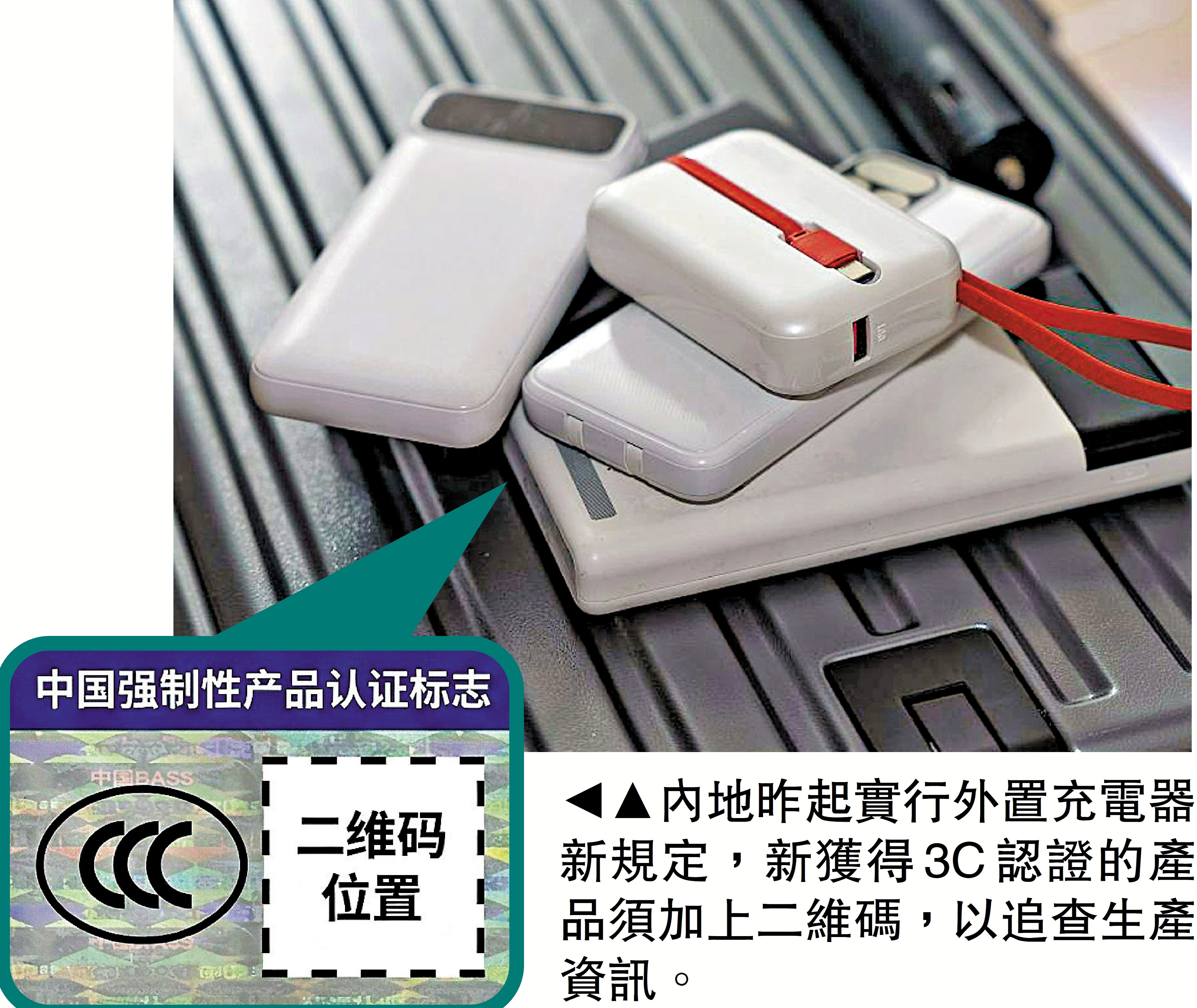 充電寶是不少人去旅行時隨身攜帶的物品,國家認證認可監督管理委員會早前宣布就3C充電寶的標誌樣式再設新要求,市民北上內地旅遊時要留意。自今年3月1日起,國家認監委將對流動電源(充電寶,俗稱「尿袋」)等風險較高的產品,實施更嚴格的新一代「3C認證」要求。除全新「CCC認證」標誌外,還需加上可追溯二維碼,作為產品「數字身份證」,否則一年過渡期後將禁止銷售。
