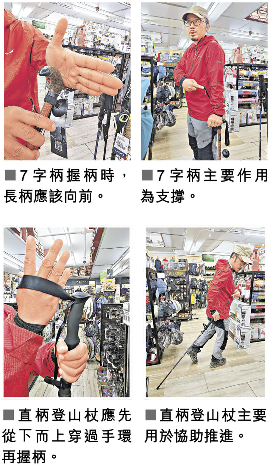 登山杖有7字柄及直柄兩種,亦分別有不同的功能與握法,Sunny為大家示範握法,以免錯誤姿勢增加手部負擔。