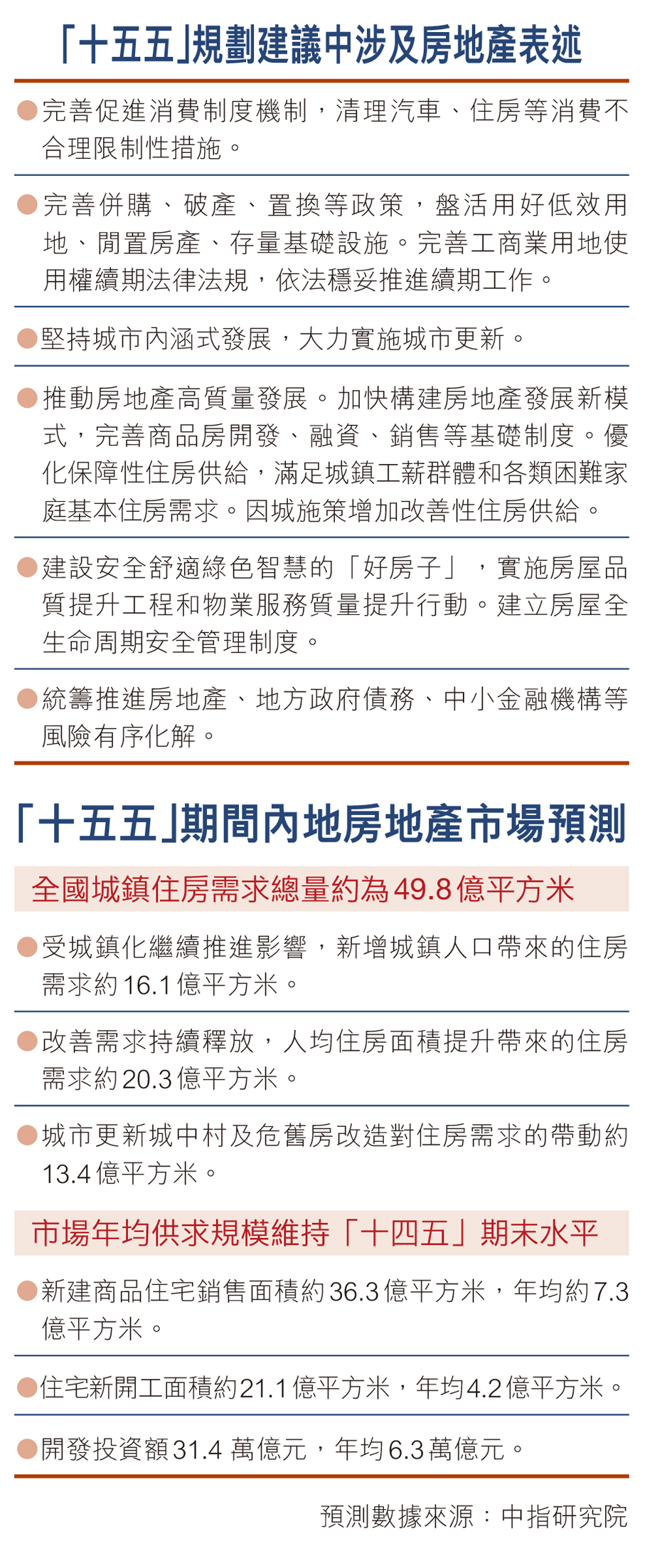 根據中指研究院測算,「十五五」期間,內地新建商品住宅年均銷售面積預計將保持在7億至8億平米左右,隨着市場庫存逐步回落,配合社會預期修復,「十五五」中後期房地產有望逐步走出調整階段。