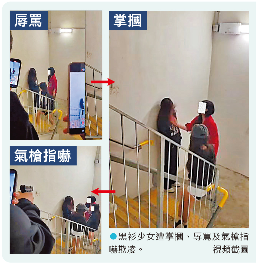 香港文匯報訊(記者 蕭景源)近日網上流傳一條童黨欺凌影片,涉及一名少女在粉嶺皇后山商場後樓梯遭年齡相若童黨包圍,用手機拍攝下施以掌摑、辱罵及氣槍指嚇欺凌經過,事件引起網民熱論。警方留意到該影片後,交由大埔反黑組跟進。探員經調查後迅速鎖定涉案黨童,昨日拘捕五人。