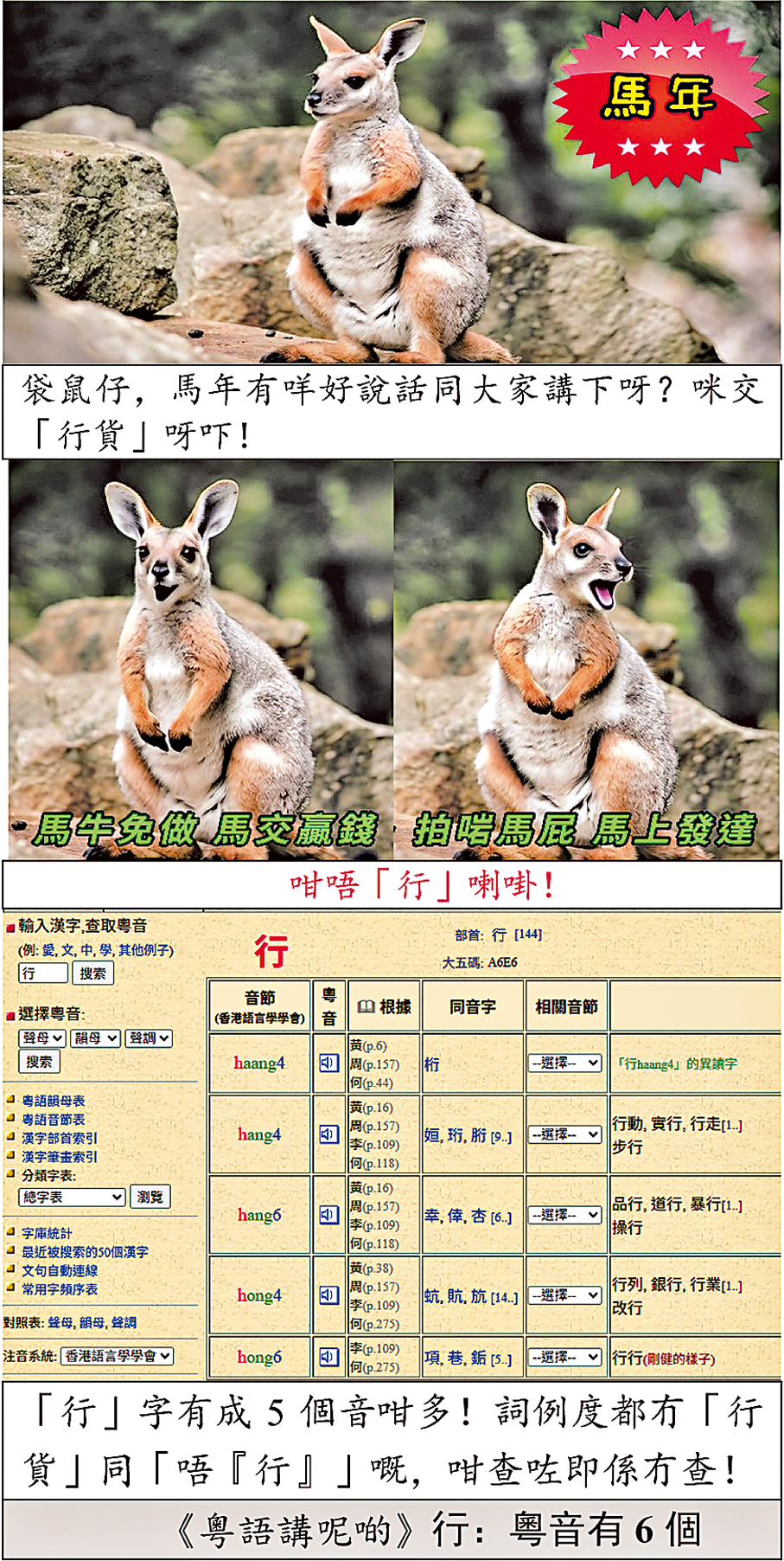 粵語中,「行」是個「多音字」——有6 個之多。最多人認識和使用的中大粵音網頁《粵語審音配詞字庫》提供了 5 個讀音,當中有「文讀(文)」【讀書音】,也有「白讀(白)」【口語讀音】。然而,不是每個讀音,尤其沒有「同音字」或「口語」那種,都有提供「詞例」,致使一般人無從知曉其適用於何種語境,出現了「欲查無門」的狀況。