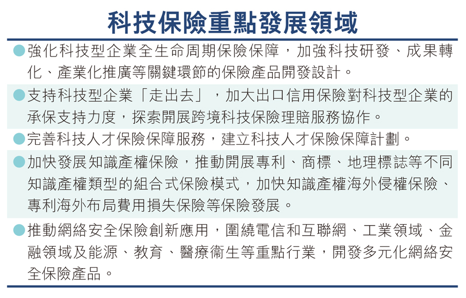 國家金融監管總局昨發布消息稱,科技部、金融監管總局、工業和信息化部、國家知識產權局近日聯合印發《關於加快推動科技保險高質量發展有力支撐高水平科技自立自強的若干意見》提出,加快構建同科技創新相適應的科技保險體制機制,建立涵蓋科技創新全鏈條、全周期的保險產品和服務體系,加大對國家重大科技任務和科技型中小企業的支持力度。該文件提出,引導保險資金投向科技創新領域,加強對新興產業和未來產業的投資布局,支持保險資金加大科技創新債券投資配置力度,推動保險資金投資科創類證券化產品。