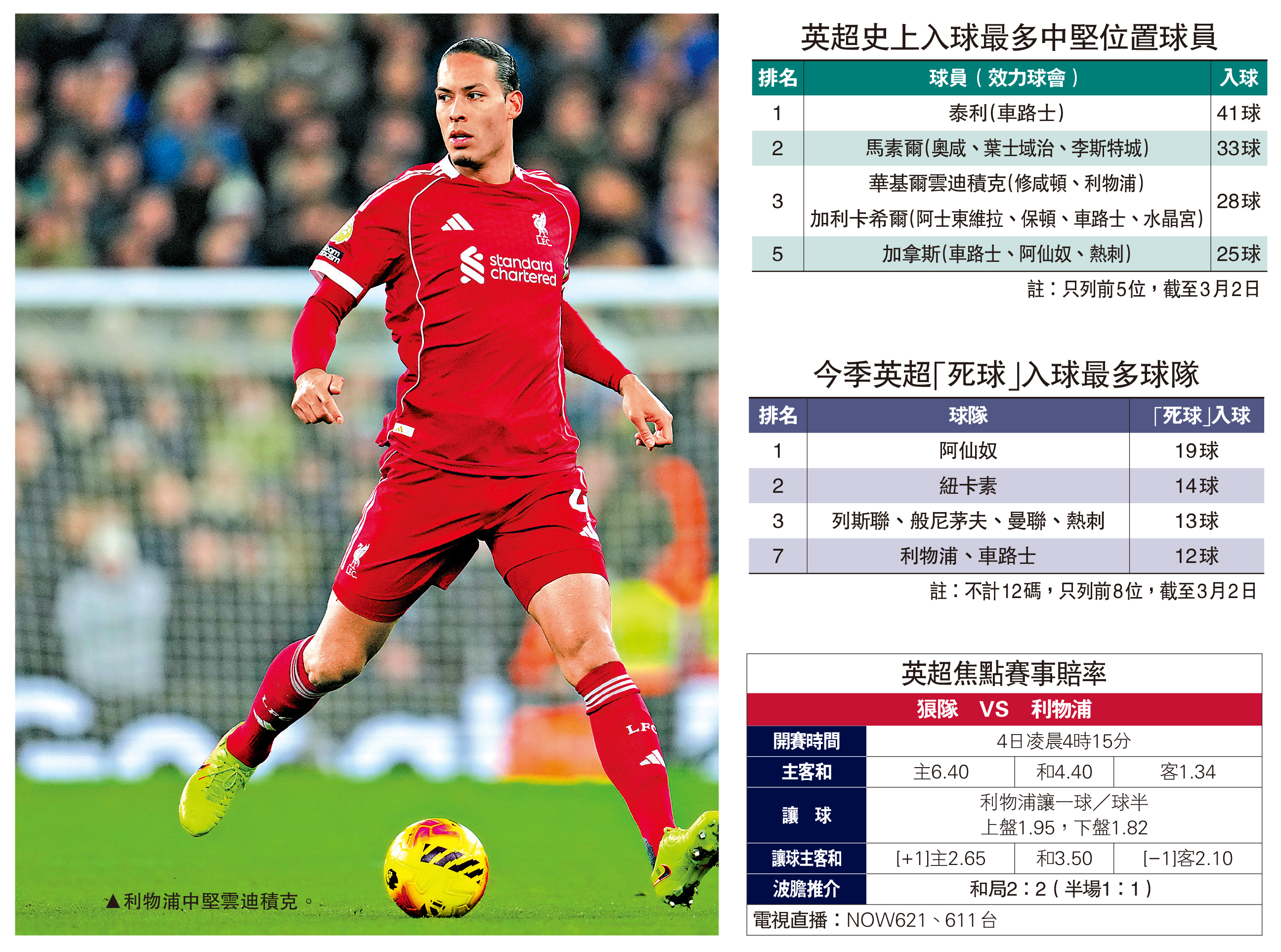重上第5位的利物浦將於香港時間3月4日凌晨英超周中特別場作客榜末的狼隊。利物浦防守死球有改善卻絕不等於穩健,反而狼隊降班格局大定下放開懷抱比賽卻收到意外效果,近2仗主場先後連追2球逼和阿仙奴及以2:0勇挫阿士東維拉,一班較年輕的球員勤於走動和逼搶之下,絕對有力逼和利物浦,「讓球」盤口狼隊獲受讓一球、球半,下盤實在不能不買。(NOW621及611台4日凌晨4時15分直播)