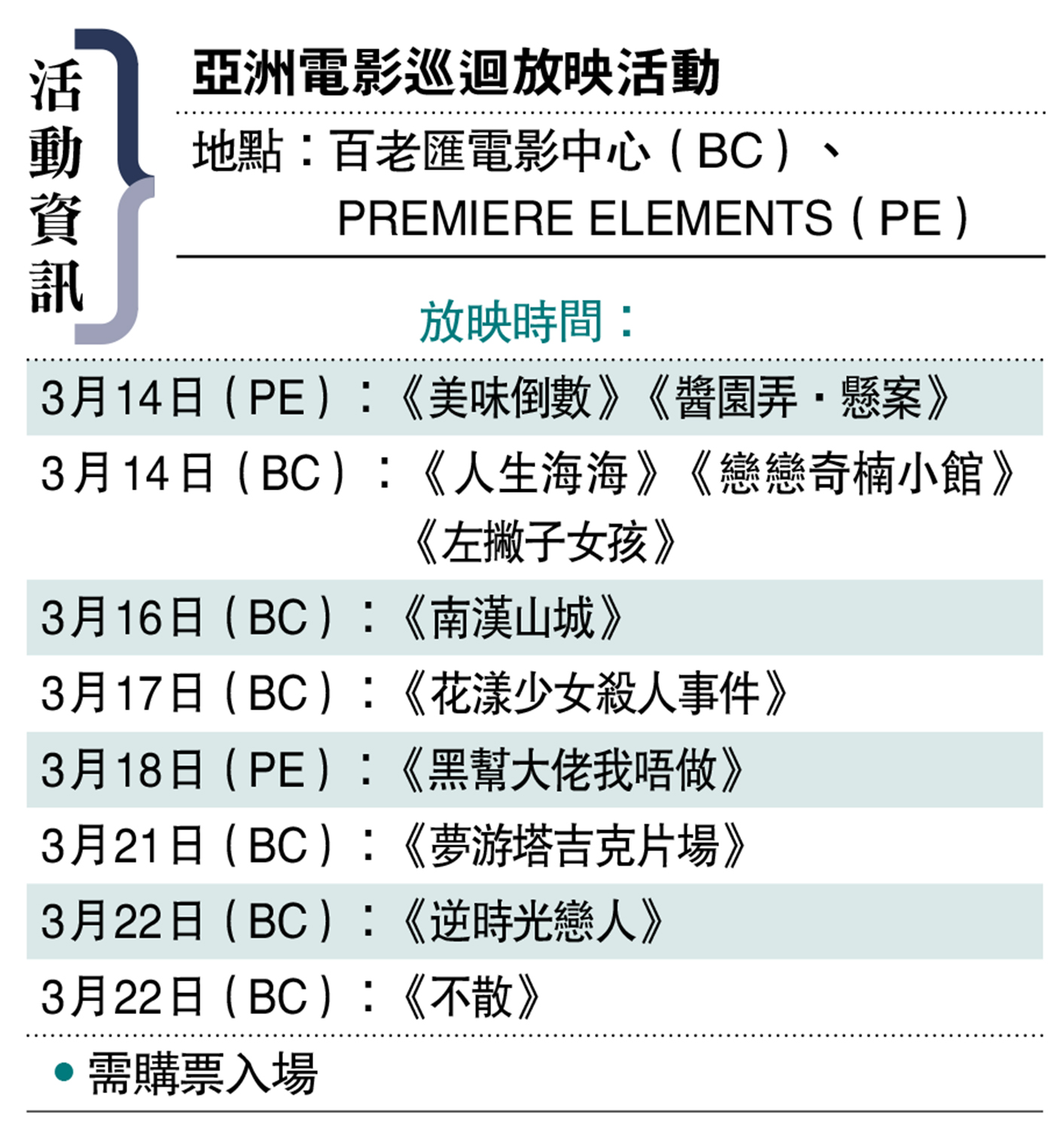 地點:百老匯電影中心(BC)、PREMIERE ELEMENTS(PE)