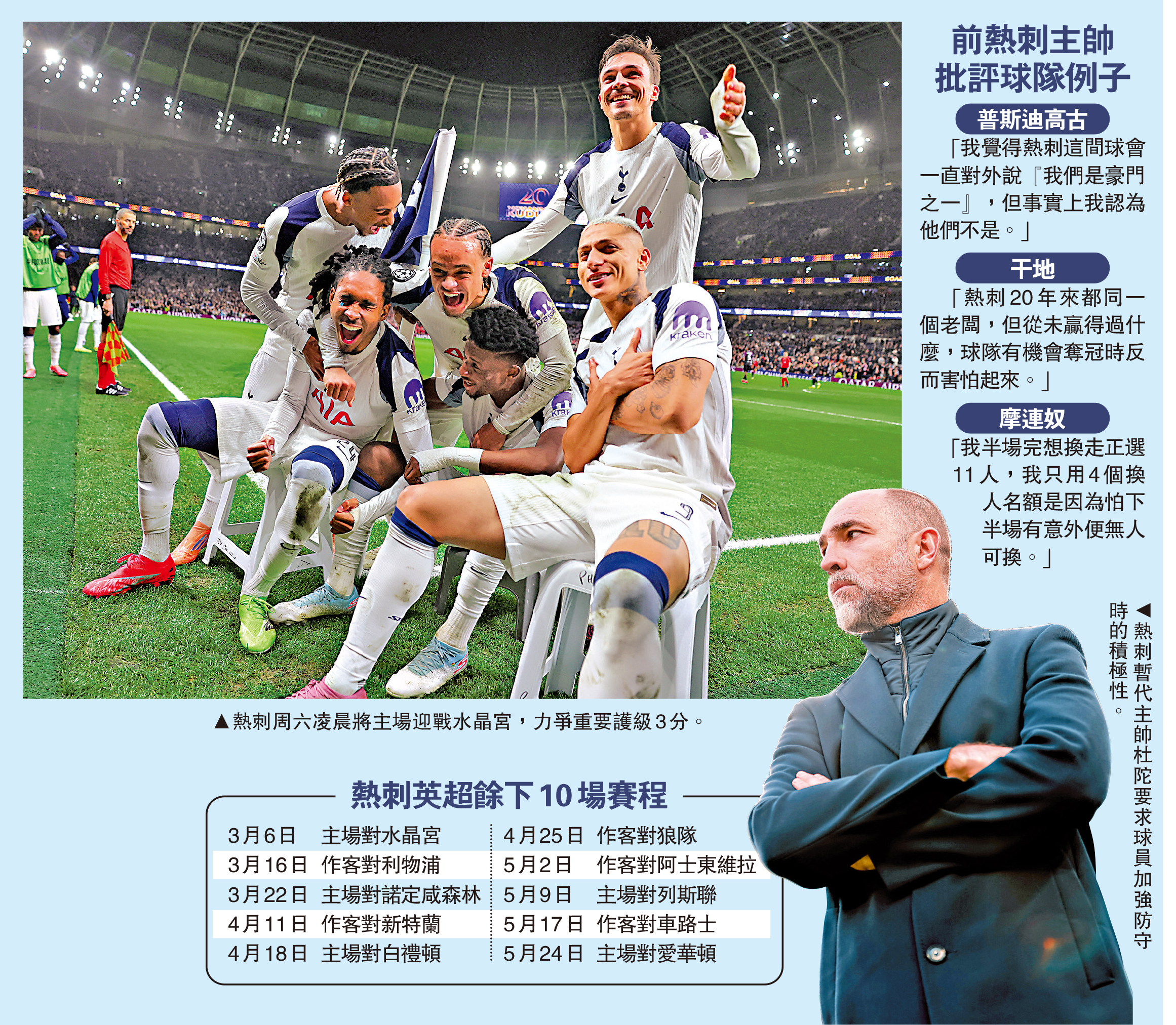 熱刺在英超已連續10場不勝,這是自1994年由球隊阿根廷名宿阿迪尼斯執教以來的首次。距離降班線只有4分,餘下10場賽事對熱刺來說猶如「10場護級決賽」,當中7日凌晨主場迎戰水晶宮就是「首場決賽」。這個關鍵時刻,球隊暫代主帥杜陀不知是對球員進行激將法還是提前投降,直言熱刺在三線及戰術頭腦方面都存在不足。要護級就一分都不能少,球員必須及時作出改善才能帶領球隊保住英超席位。\大公報記者 梁潤森