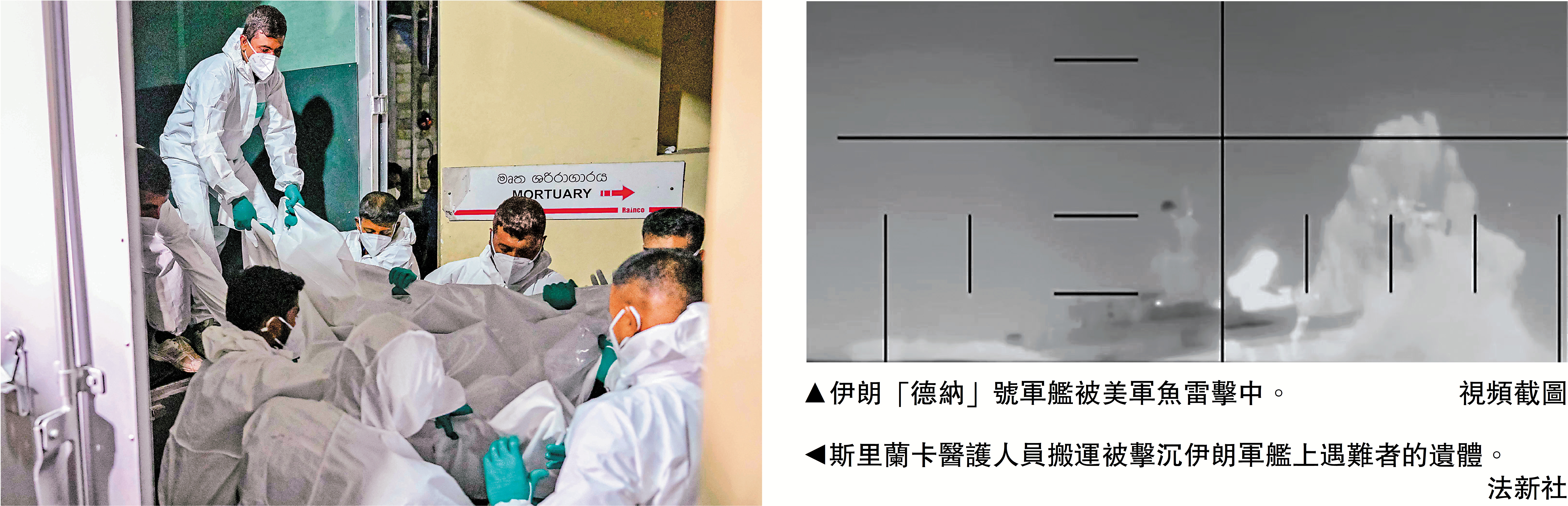斯里蘭卡政府4日稱,美軍潛艇在印度洋襲擊一艘伊朗軍艦,已打撈出87具遇難人員遺體。當天稍早時間,斯海軍方面消息稱,伊朗海軍「德納」號護衛艦在斯里蘭卡以南海域疑似遭潛艇襲擊,已救出32人。斯海軍沒有在事發區域發現任何其他船隻或飛機。