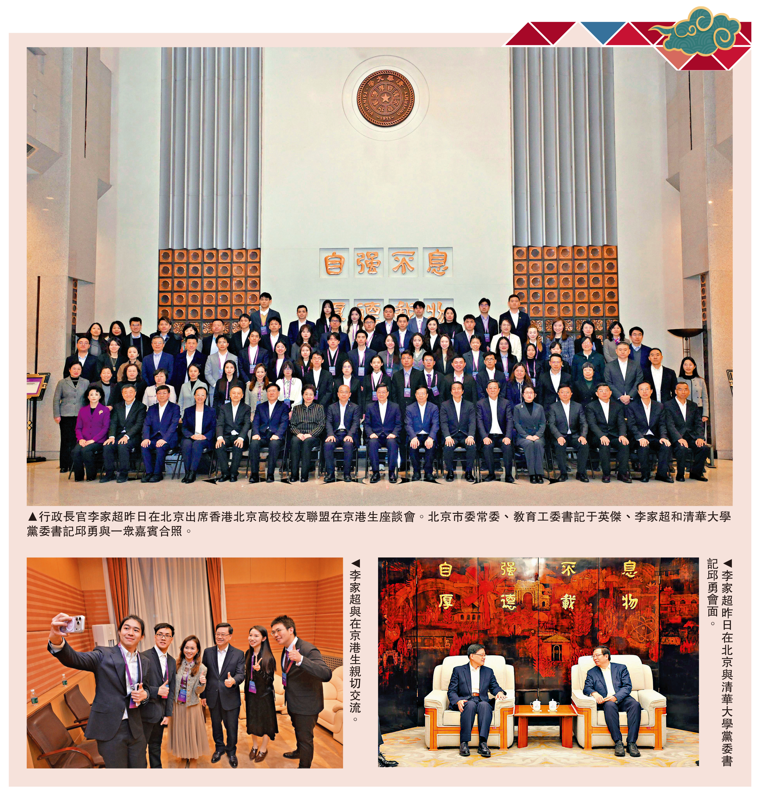 行政長官李家超昨日繼續北京訪問行程,與當地高校領導會面。他下午與清華大學黨委書記邱勇交流,並出席香港北京高校校友聯盟舉行的在京港生座談會。