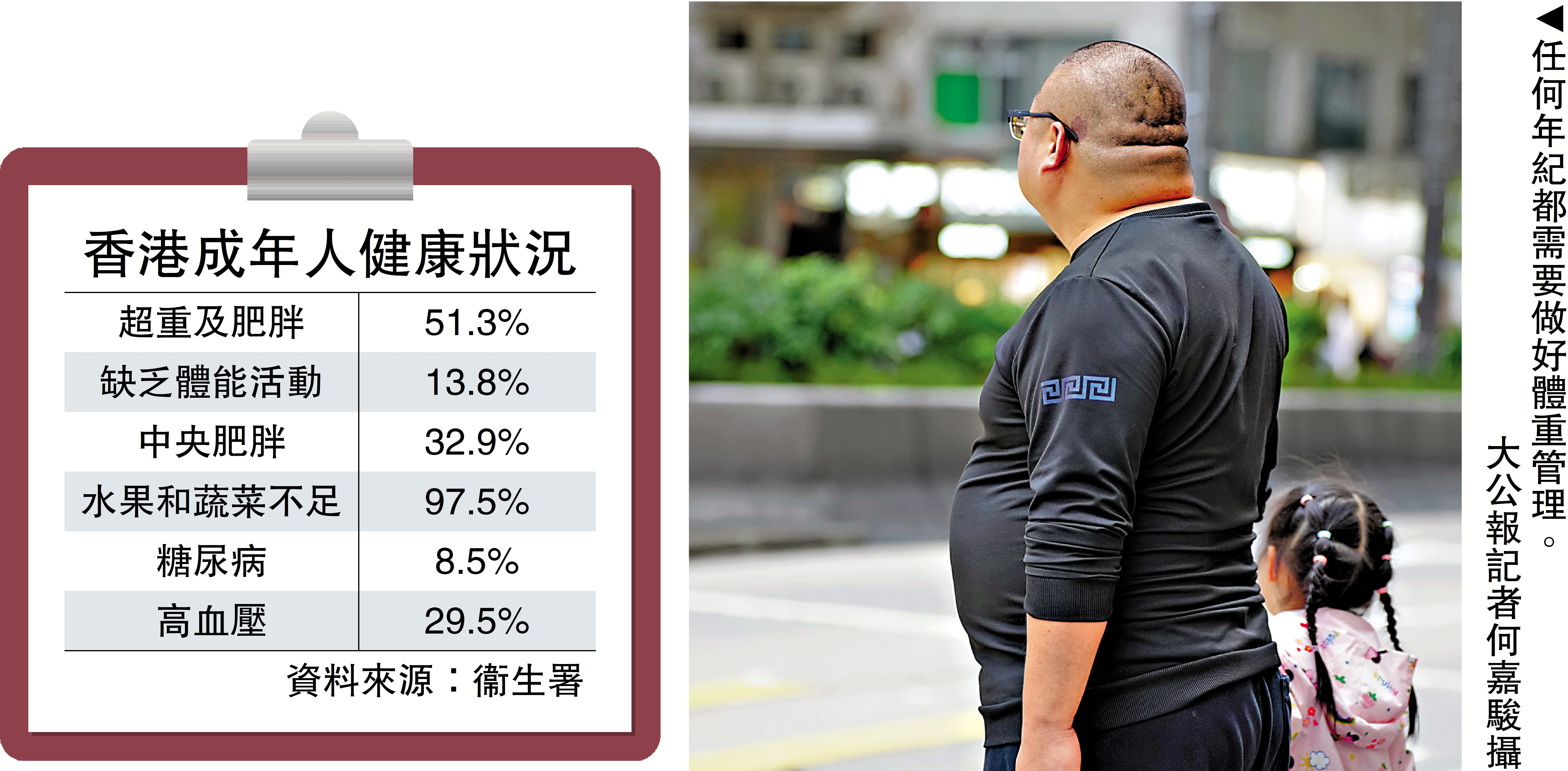 衞生署衞生防護中心非傳染病處主任奚安妮表示,本港成年人的超重及肥胖年齡標準化普遍率,過去10年持續上升,由2014年的47%升至2022年的51.3%。65%的超重人士認為自己體重過輕或「適中」,有40%在調查前12個月無採取體重管理行為,顯示市民對自身體重存在誤解。