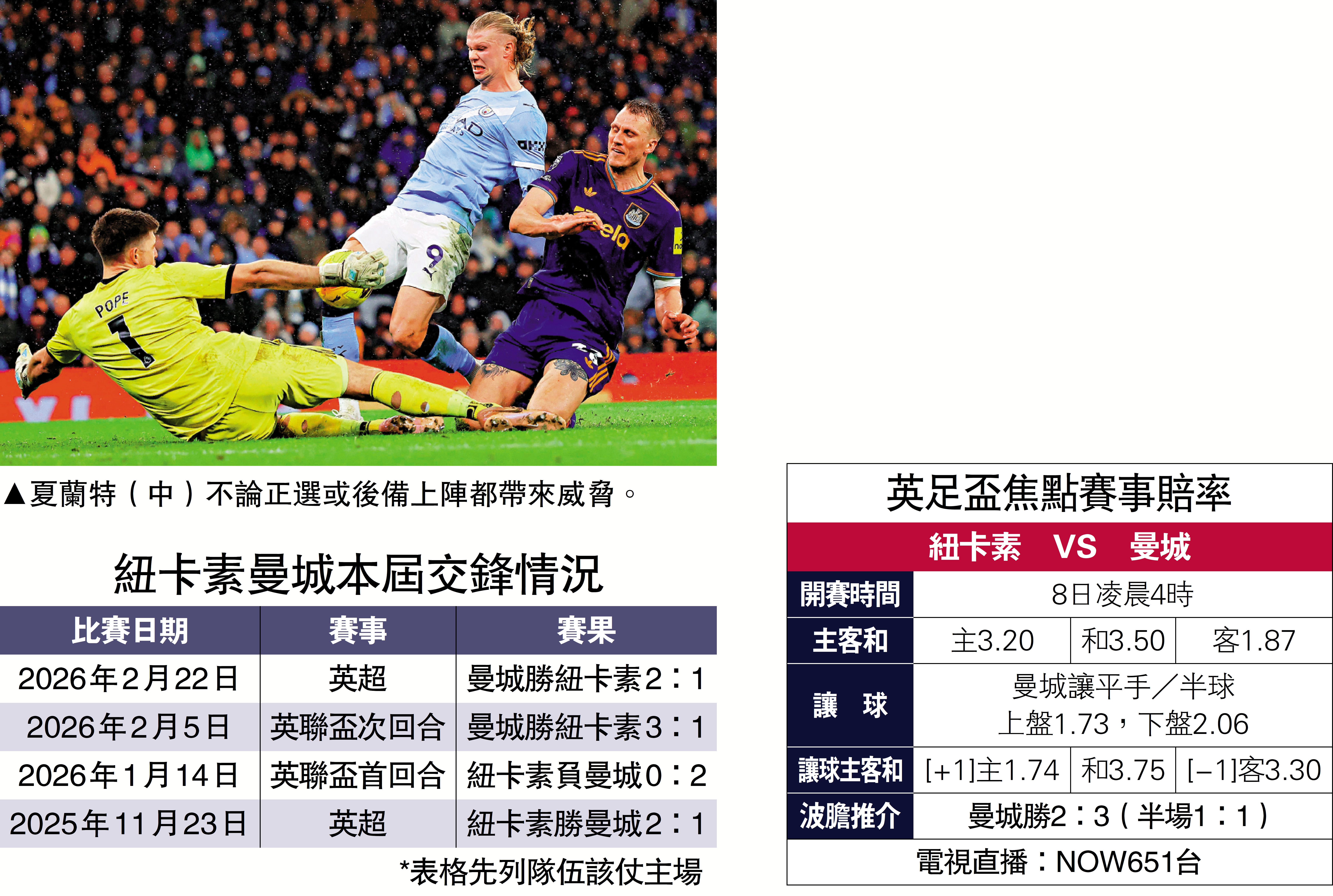曼城與紐卡素在近2個月3度在英超和聯賽盃4強相遇,結果曼城全勝,連同聯賽次循環的勝仗,近4場交鋒取3連勝1負,所負一仗已是去年11月的賽事。曼城下場歐聯作客皇家馬德里,今場或作較大幅度輪換,尼高干沙利斯、雷恩達斯、謝利美杜古、馬莫殊、沙雲奴等都有望任正選,眾人能力亦毋庸置疑。紐卡素就比曼城早1天在主場硬撼巴塞隆拿,預計如韋利安奧索拿、尤尼韋沙、積及梅菲與上場對曼聯因病缺席的禾達美迪都有望擔正,惟已連續6場踢足的中場主將辛度東拿利總需要休息,紐卡素的戰力難免大減。