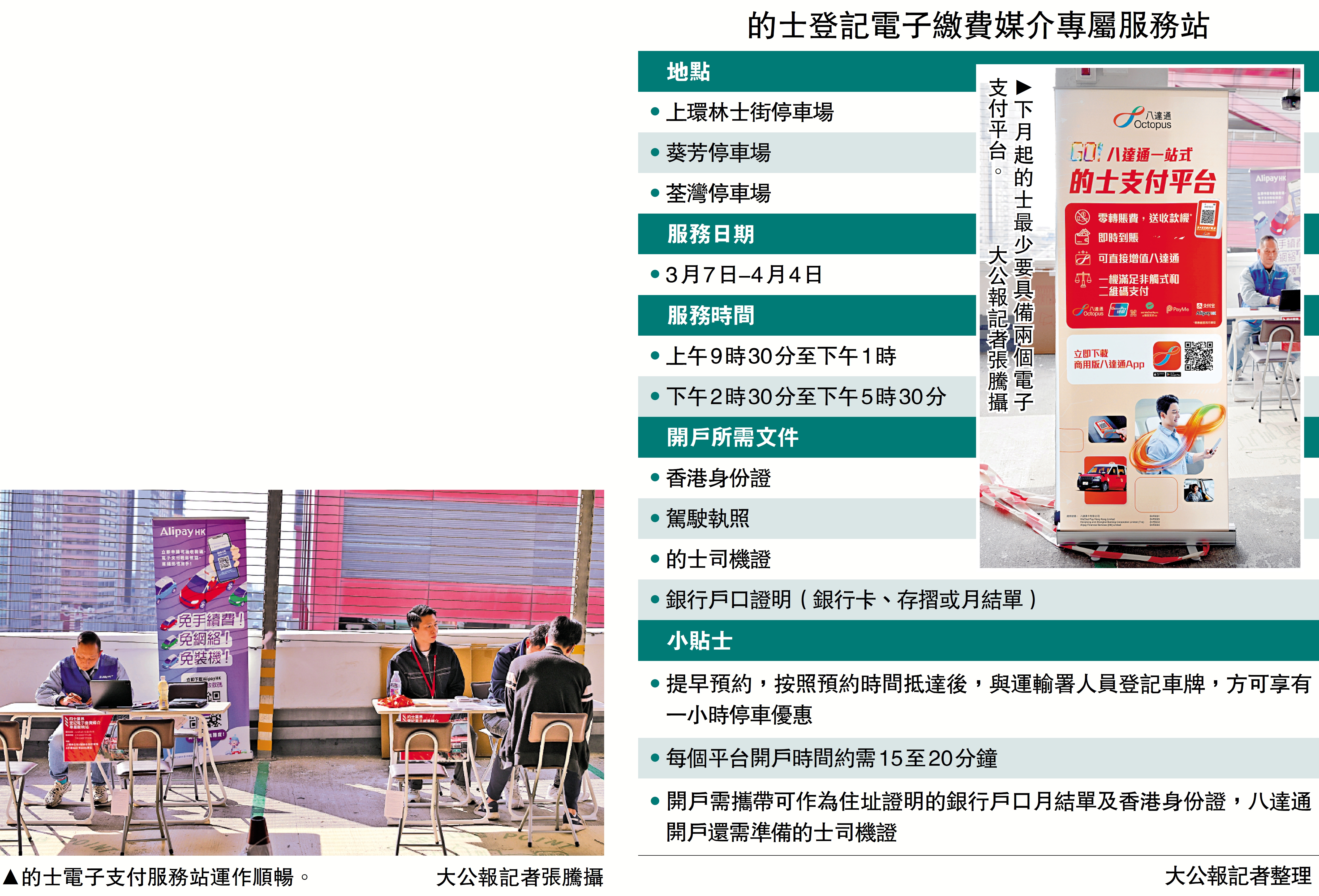 運輸署昨日回覆大公報查詢表示,一直鼓勵和協調各主要電子繳費媒介平台舉辦活動,協助的士司機開立電子繳費媒介戶口,以及指導他們如何透過電子媒介收取車費和查閱收費紀錄。除專屬服務站外,還會有兩場工作坊,將分別在西營盤(3月11日)和油麻地(3月20日)舉行。該署呼籲未安裝電子繳費媒介的司機,盡快預約登記。該署會繼續透過不同渠道,加大力度宣傳和教育的士司機提供電子繳費媒介予乘客繳付車費。