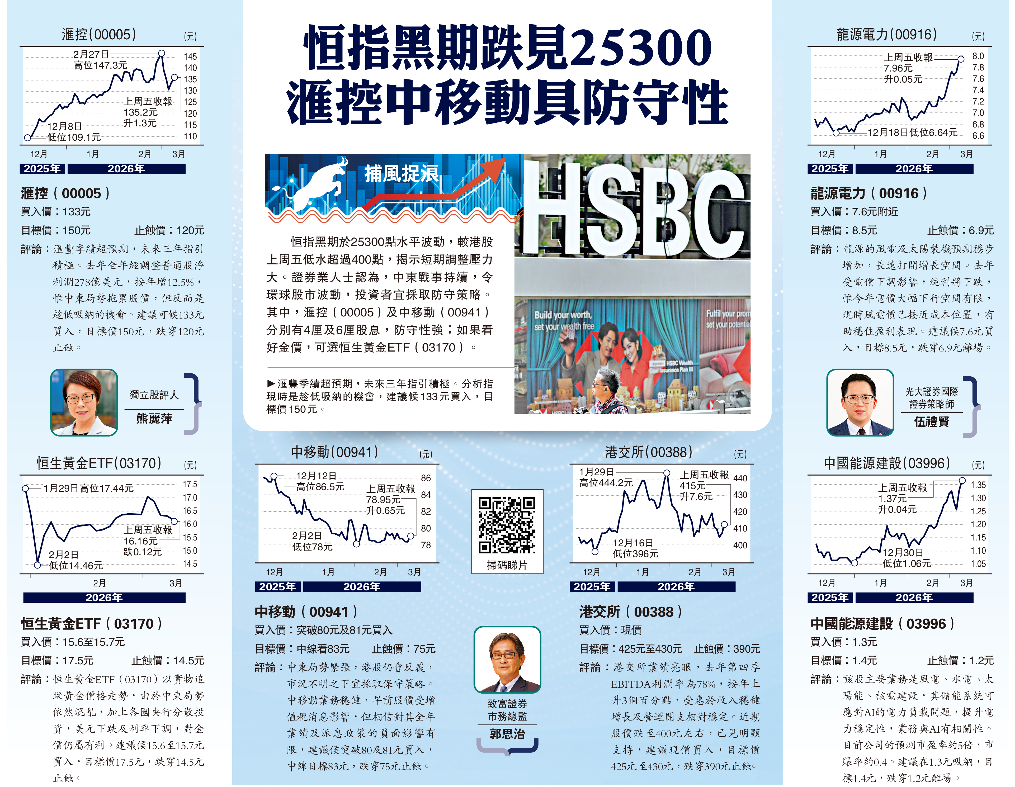 恒指黑期於25300點水平波動,較港股上周五低水超過400點,揭示短期調整壓力大。證券業人士認為,中東戰事持續,令環球股市波動,投資者宜採取防守策略。其中,滙控(00005)及中移動(00941)分別有4厘及6厘股息,防守性強;如果看好金價,可選恒生黃金ETF(03170)。
