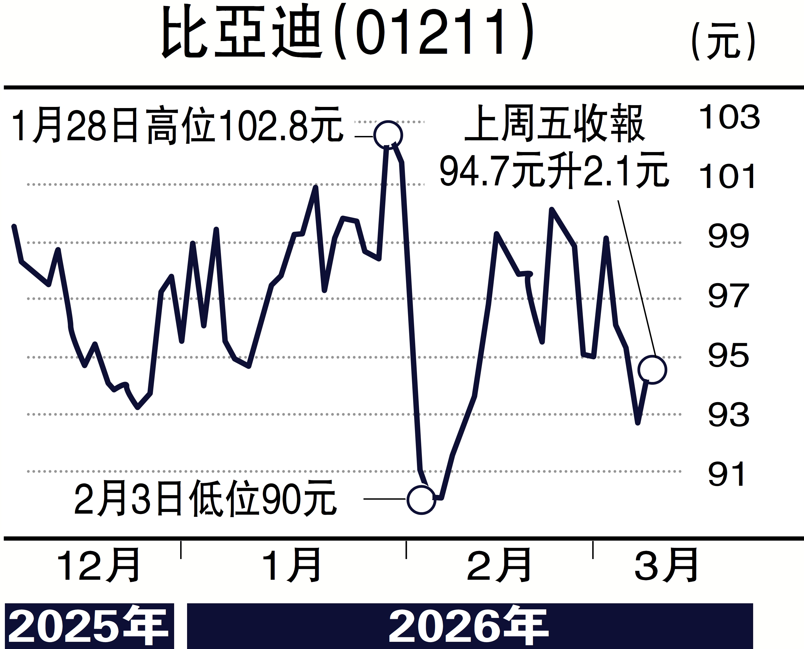 該行對比亞迪維持「買入」評級,H股目標價139元。比亞迪A股及H股年初至今分別下跌3%及上升1%,主要由於補貼支持減少、市場季節性疲弱及車型周期轉換導致1月及2月國內銷量大幅下跌。此外,成本壓力上升,在2026年第一季對車企盈利能力構成壓力。而該行相信比亞迪有能力透過向消費者強調高價值功能,同時透過物料清單重新設計簡化不顯眼元素,部分抵銷成本上漲。