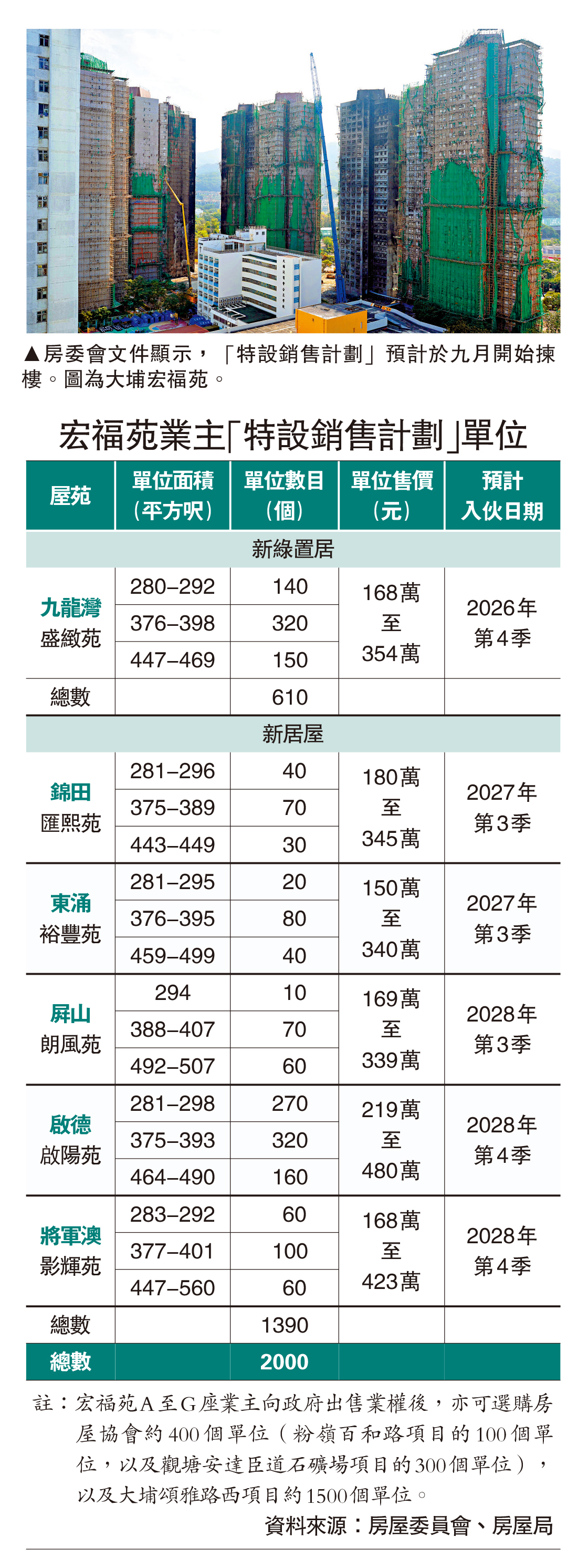 宏福苑合共八座,將近2000戶,面積介乎431至483平方呎。其中七座合共1736個業戶,可參與「特設銷售計劃」。房委會近日在網上公開會議文件顯示,今年至2028年期間入伙的六個屋苑,將有2000個單位預留給宏福苑居民,面積介乎280至560平方呎。其中,啟德居屋啟陽苑提供的單位量最多,共750個;其次為九龍灣盛緻苑,有610個單位。