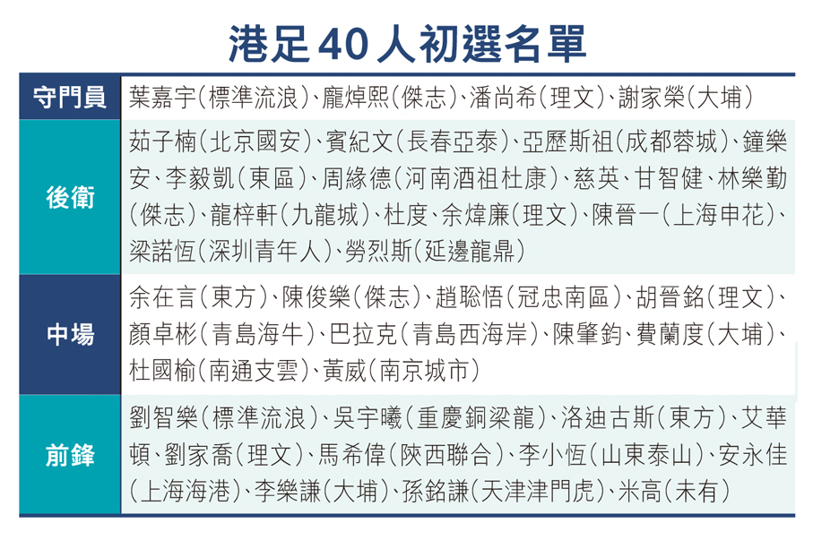 港足公布月底賽事初選名單