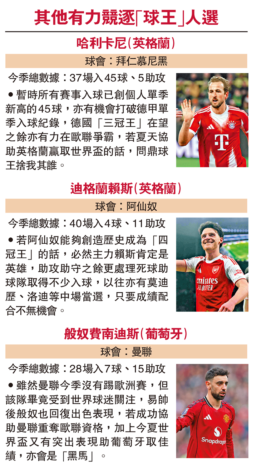 •雖然曼聯今季沒有踢歐洲賽,但該隊畢竟受到世界球迷關注,易帥後般奴也回復出色表現,若成功協助曼聯重奪歐聯資格,加上今夏世界盃又有突出表現助葡萄牙取佳績,亦會是「黑馬」。