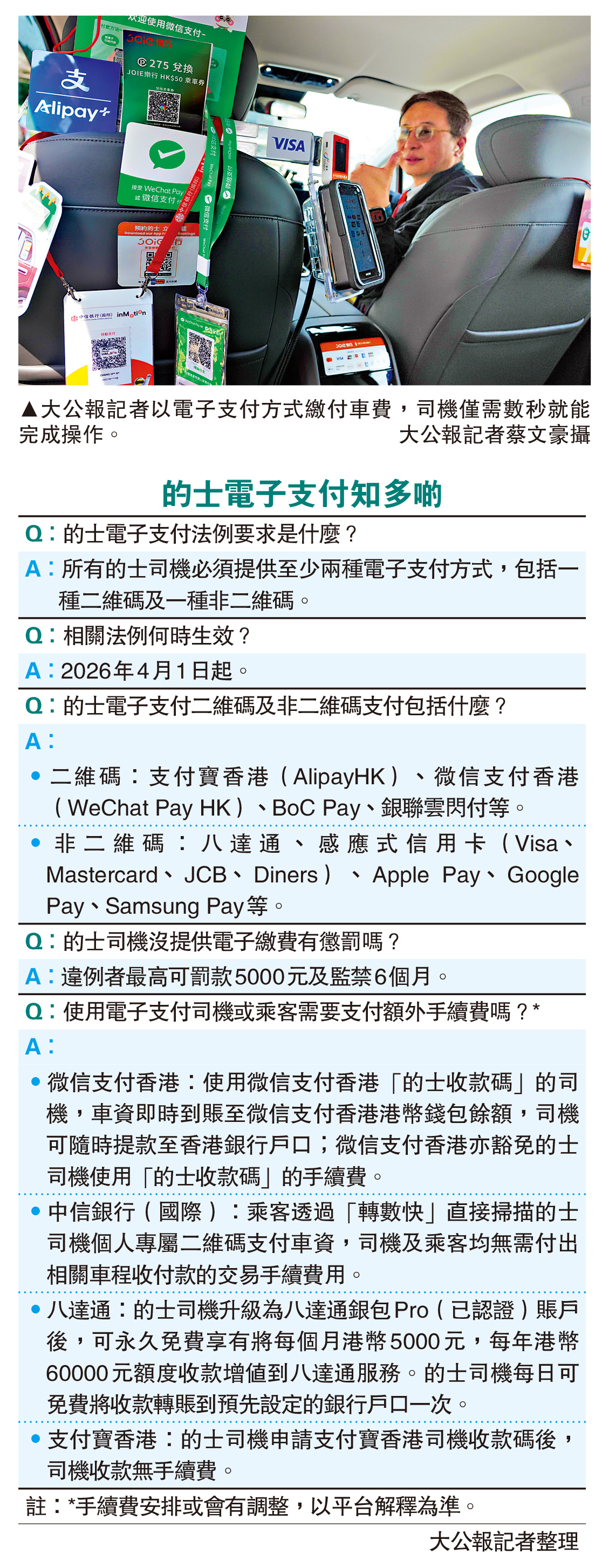 下月起所有的士必須向乘客提供最少兩種電子支付方式,多個電子支付平台豁免司機的手續費或提供迎新優惠吸引司機登記。運輸署昨日表示,全港三分之一的士已安裝一體式收款機,可以支援多種電子繳付方式。