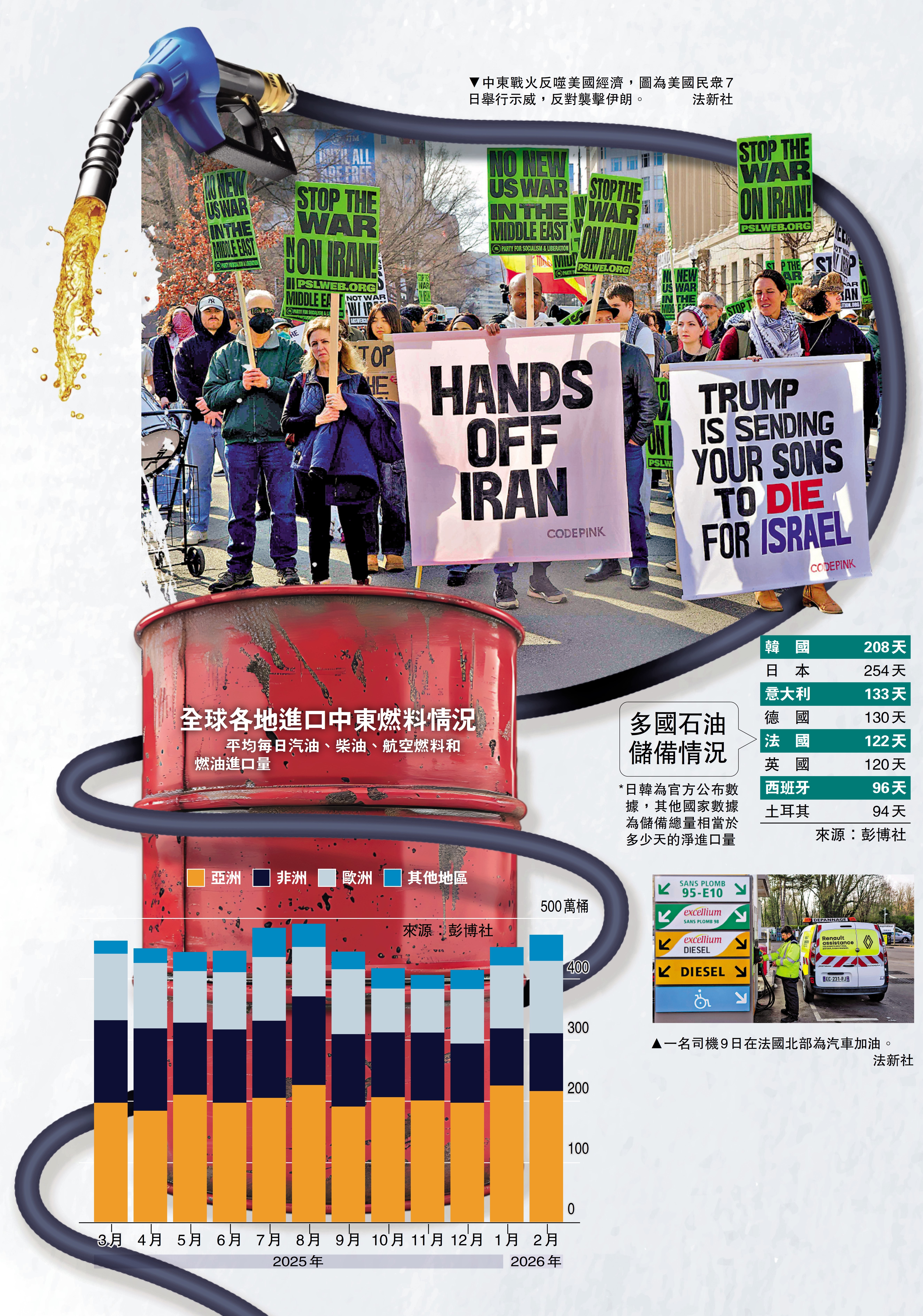 美國和以色列對伊朗開戰,導致全球能源市場劇烈波動,多國出現油價飆升,嚴重影響民生。國際能源署(IEA)11日發表聲明說,32個成員國一致同意釋放4億桶戰略石油儲備,以應對全球石油供應緊張的局面。IEA署長比羅爾當天稱,釋放4億桶戰略石油儲備,規模為史上最大。然而,這僅僅相當於全球3至4天的能源供應量。與此同時,多國也出台監管措施,限制加油站燃油價格,以防企業「趁火打劫」。\大公報記者 郭嘉