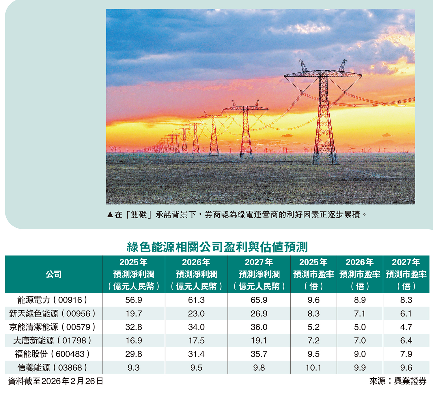 雖然綠電運營商現時面對基本面壓力,包括增值稅退稅取消、企業所得稅「三免三減半」等優惠政策陸續到期,以及市場化電價下行等,可能使其2026年利潤受壓,不過興業證券指出,隨着「容量電價政策」落地,以及「十五五」時期要實現碳達峰,有望促進綠電環境價值釋放。