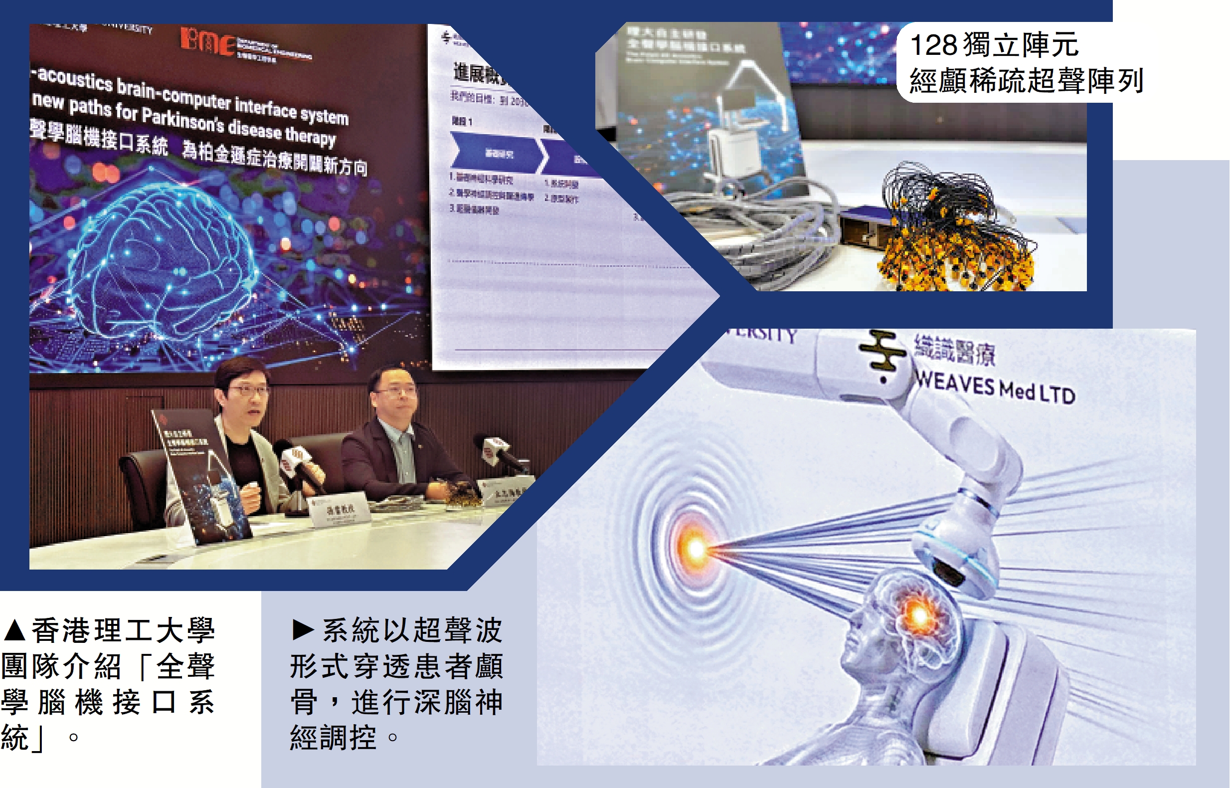 國家「十五五」規劃綱要提出布局未來產業,構建全鏈條培育體系,其中明確提出推動「腦機接口」成為新的經濟增長點。香港理工大學團隊率先研發「全聲學腦機接口系統」,冀以超聲波實現無創神經調控,為柏金遜症患者帶來嶄新的治療方案。\大公報記者 林天