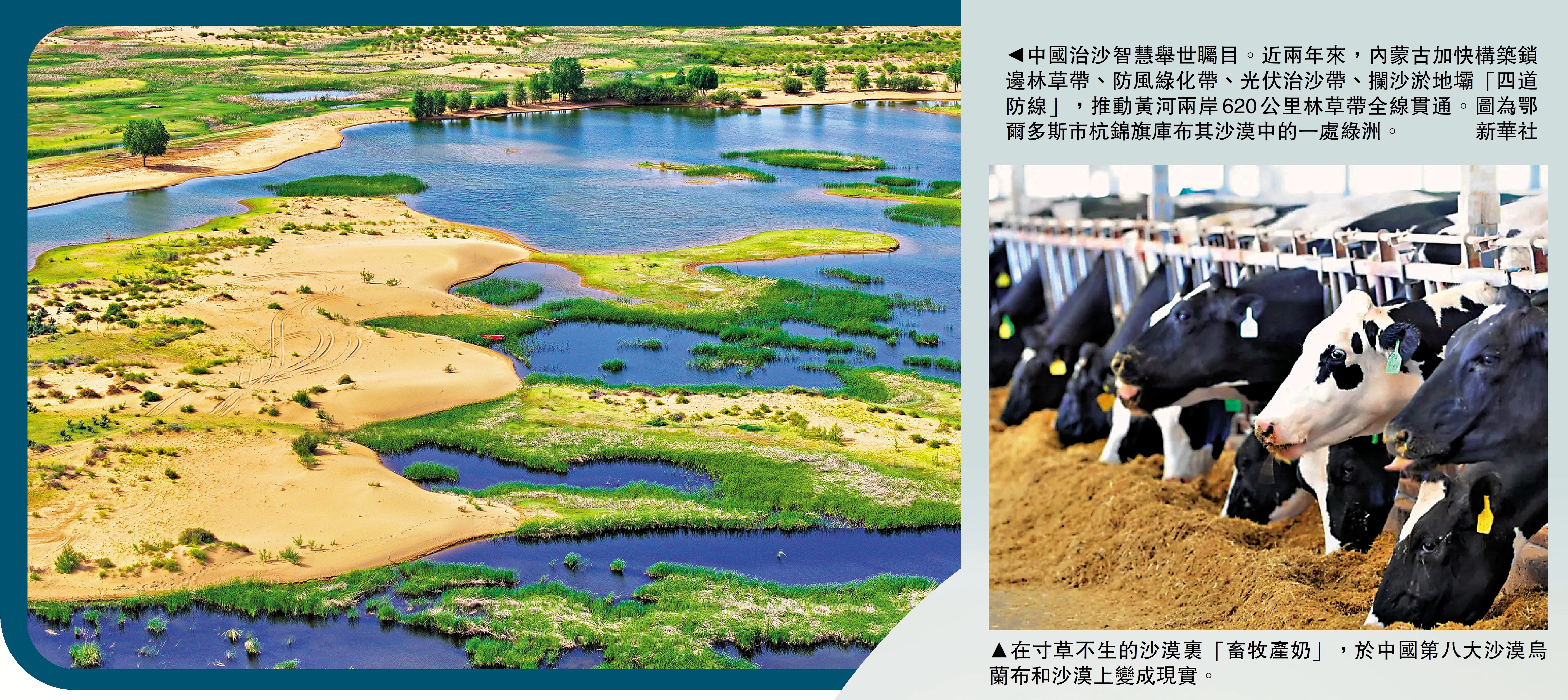 在寸草不生的沙漠裏也能「畜牧產奶」?這一匪夷所思的場景,在中國第八大沙漠烏蘭布和沙漠上一步一步變成現實,「死亡之沙」長出「生命綠洲」。內地乳業巨企攜手牧羊人研發農業智能裝備,加速沙漠有機生產,用牛糞為草苗抵禦風沙,經歷無數次嘗試,全面構建起「治沙─養土─飼餵─生產」的產業鏈閉環,讓黃色沙漠成為可以「種牛奶」的寶地。國際專家和友人表示,這是令人難以置信的綠色成果,中國創新的治沙經驗值得借鑒,助力全球生態治理。
