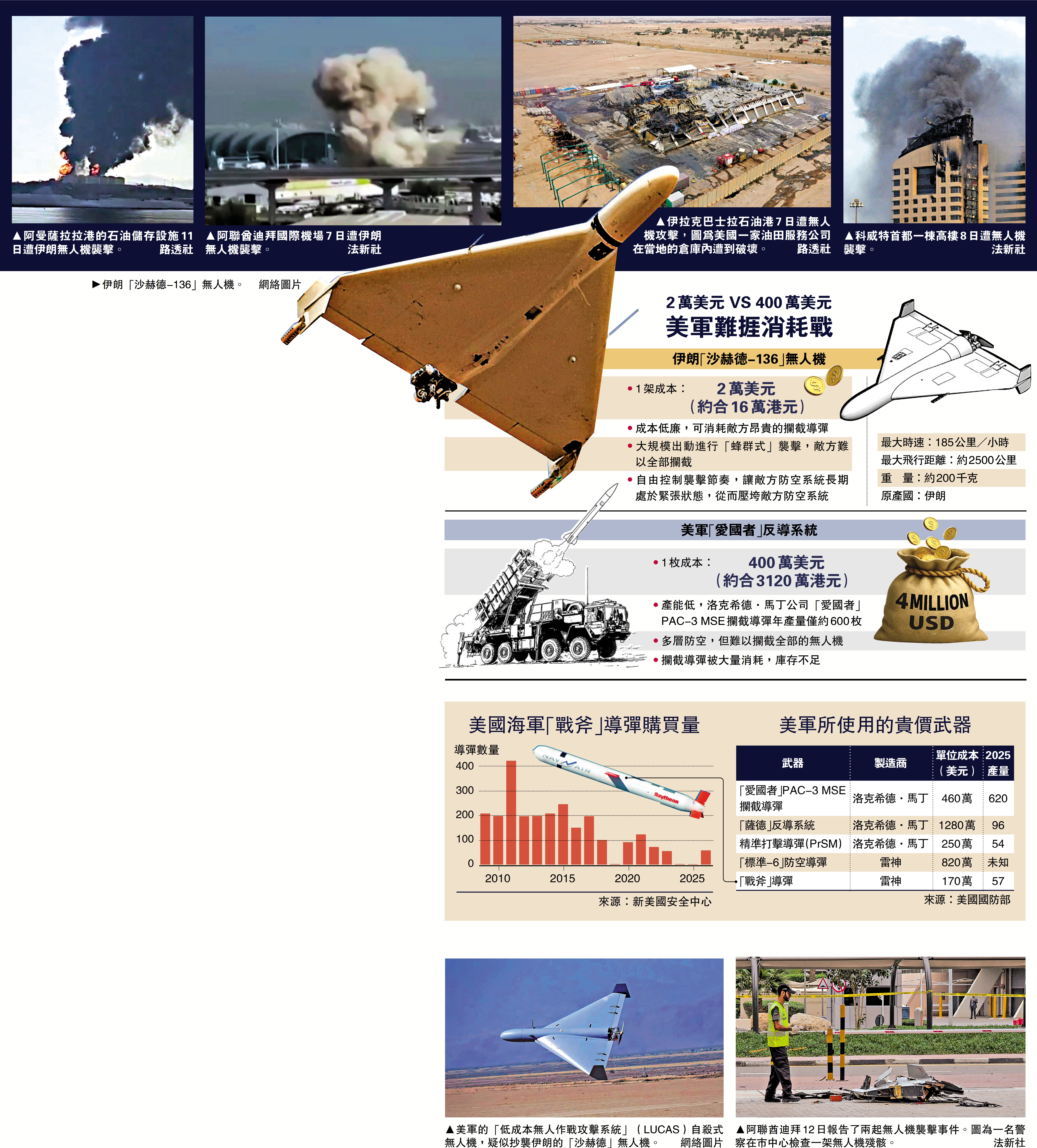 【大公報訊】從俄烏戰爭到美國、以色列對伊朗的襲擊,無人機都被大量運用,同時也從輔助偵察工具,轉為除巡航導彈外,最主要的攻擊手段之一。伊朗「沙赫德」無人機成本低,造價在2萬至5萬美元(約合16萬港元至39萬港元),實際殺傷力卻不容小覷,堪稱「空中AK-47」。相較之下,美軍及其中東盟友所使用的「愛國者」反導系統,單枚導彈可超過400萬美元(約合3120萬港元),兩者成本差距達百倍。至於最高端的「薩德」(THAAD)攔截系統,一枚導彈造價高達1200萬美元(約合9360萬港元)。