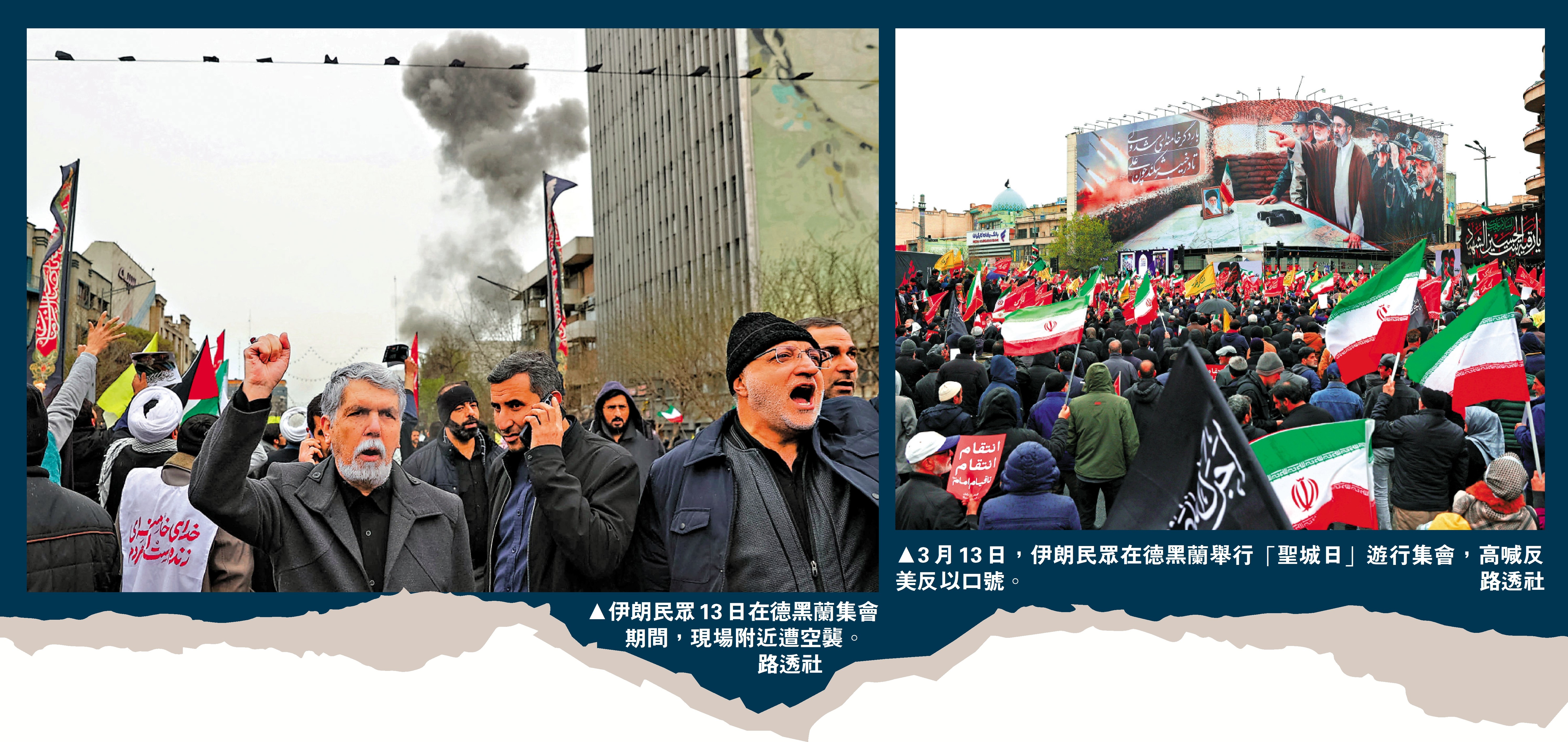 美以襲擊伊朗已持續兩周,伊朗全國多地13日舉行「聖城日」遊行,首都德黑蘭的集會現場附近多次傳出巨大爆炸聲響,造成至少1人死亡。伊朗媒體稱,以色列國防軍當天稍早曾發表聲明,要求德黑蘭一些地區的人員撤離。現場視頻顯示,爆炸發生後,示威民眾並沒有離開,而是繼續高舉伊朗國旗,呼喊反美反以口號。\大公報記者 陳明