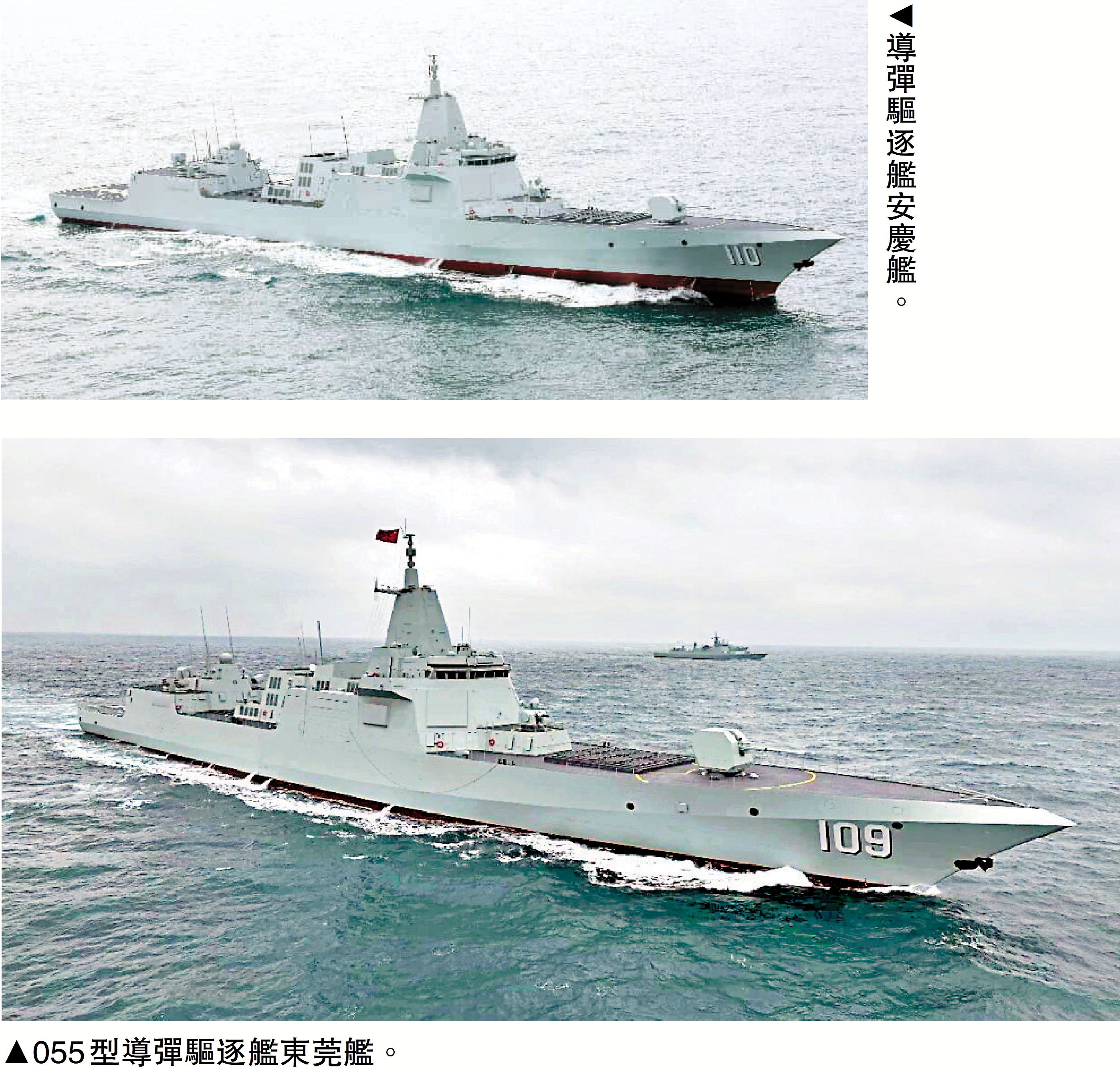 【大公報訊】綜合新華社、央視新聞報道:近日,055型導彈驅逐艦東莞艦(舷號109)、安慶艦(舷號110)同步列裝東部戰區海軍,兩艘艦艇分別在東海某海域開展了首次海上訓練。至此,我國055型導彈驅逐艦列裝數量達到10艘。
