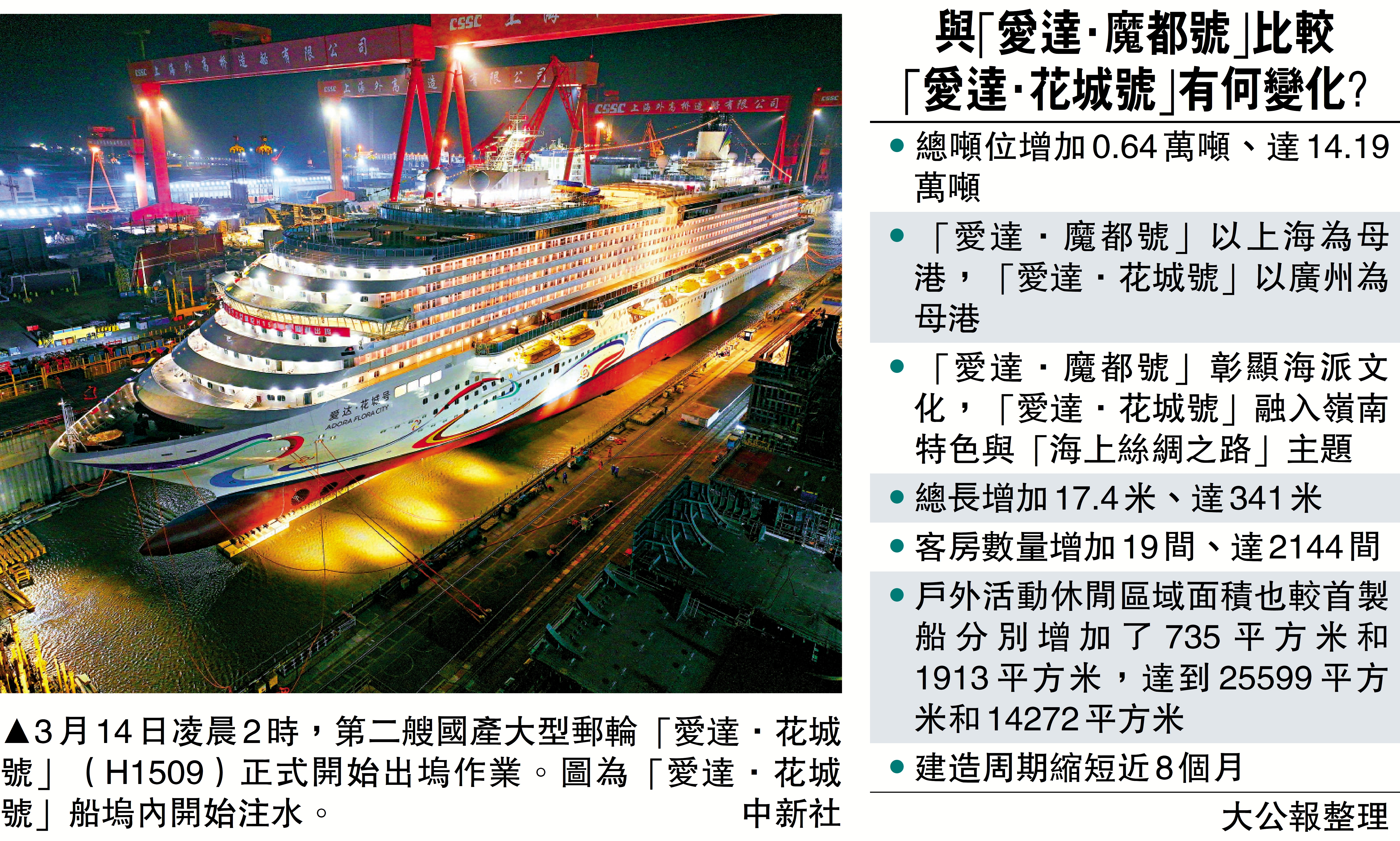 【大公報訊】綜合中通社、解放日報報道:中國第二艘國產大型郵輪「愛達·花城號」3月14日完成了塢內注水,順利起浮,擬3月20日出塢。