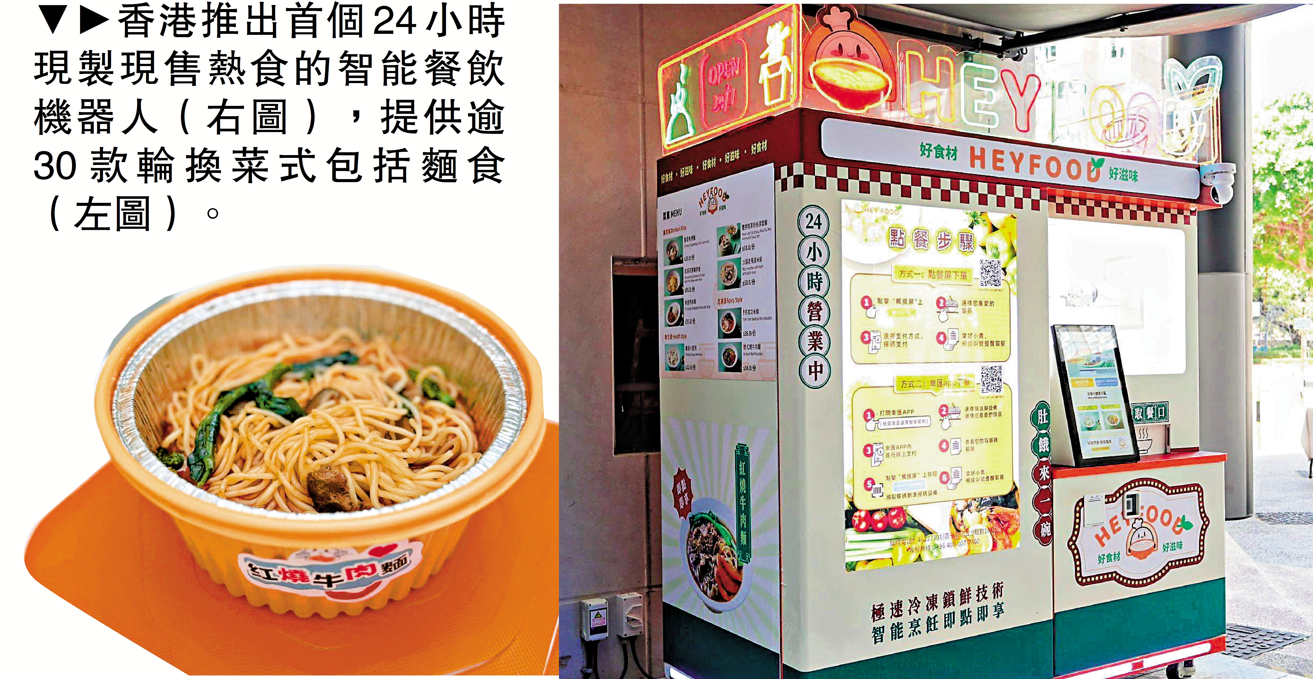 「HEYFOOD 智慧餐飲機器人」開業啟動禮昨日在大埔墟幸匯商場舉行。該機器人是香港首個實現24小時現製現售熱食、全流程自動化操作的智慧餐飲設備,從接單到出餐最快僅需3分鐘。現時設備已儲備逾30款輪換菜式,涵蓋麵食、餛飩、小食等多元品類。