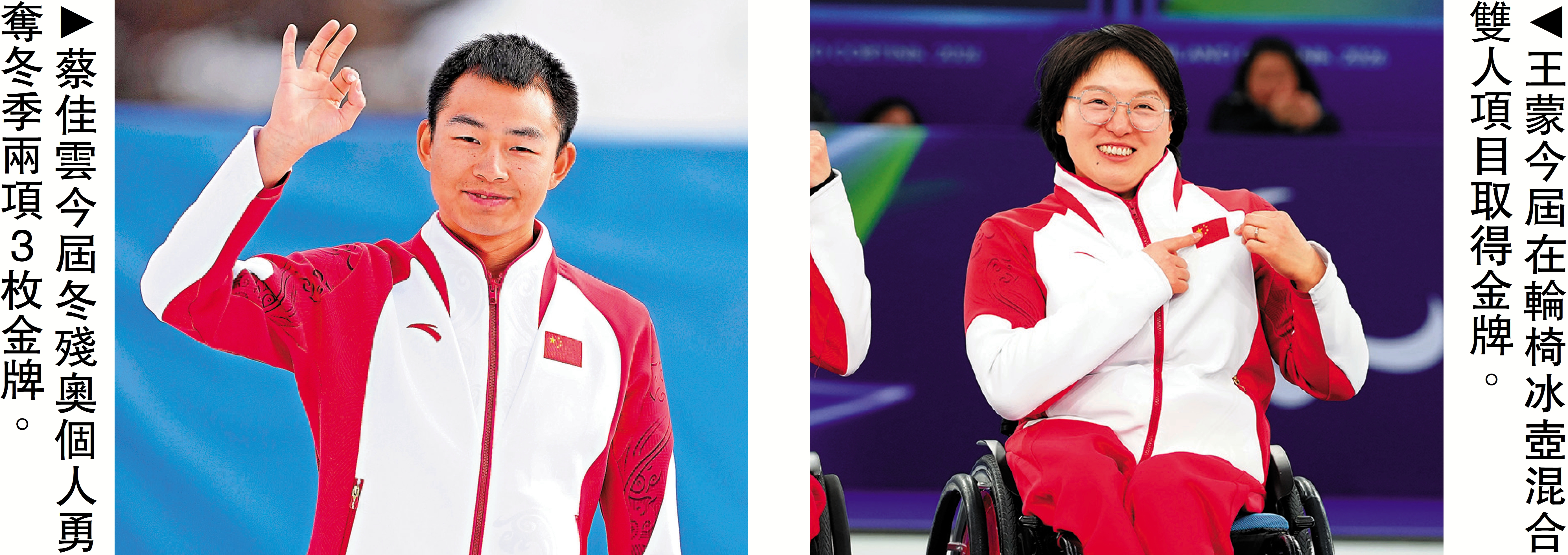 蔡佳雲在本屆冬殘奧會上勇奪冬季兩項男子7.5公里站姿組、12.5公里站姿組、短距離追逐站姿組3枚金牌,是本屆冬殘奧會中國代表團首金得主,且為獲得金牌數最多的選手。王蒙在本屆冬殘奧會和隊友楊金橋攜手出戰,勇奪輪椅冰壺混合雙人項目金牌,此項目為冬殘奧會新設項目,這枚金牌具有歷史意義。