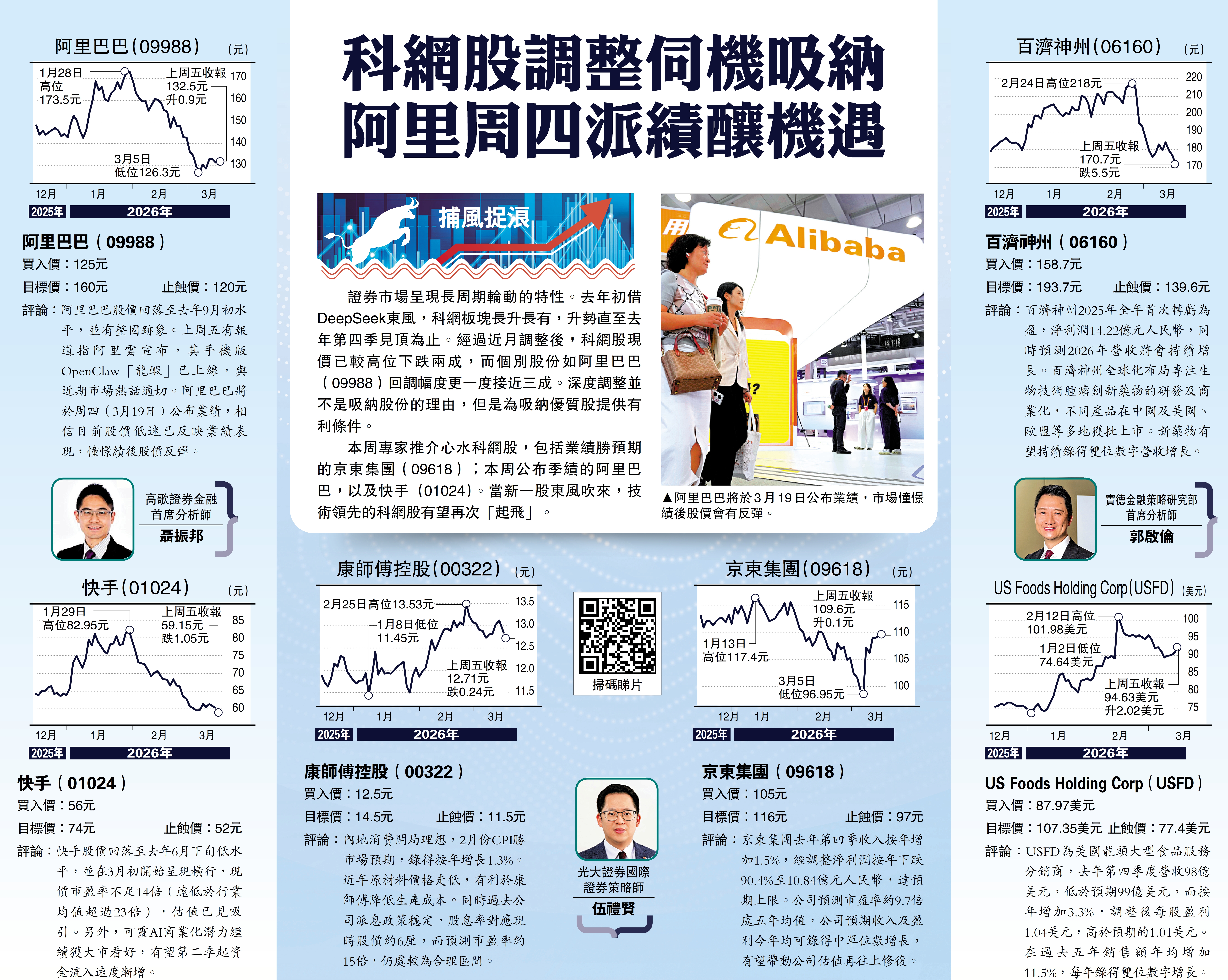 證券市場呈現長周期輪動的特性。去年初借DeepSeek東風,科網板塊長升長有,升勢直至去年第四季見頂為止。經過近月調整後,科網股現價已較高位下跌兩成,而個別股份如阿里巴巴(09988)回調幅度更一度接近三成。深度調整並不是吸納股份的理由,但是為吸納優質股提供有利條件。