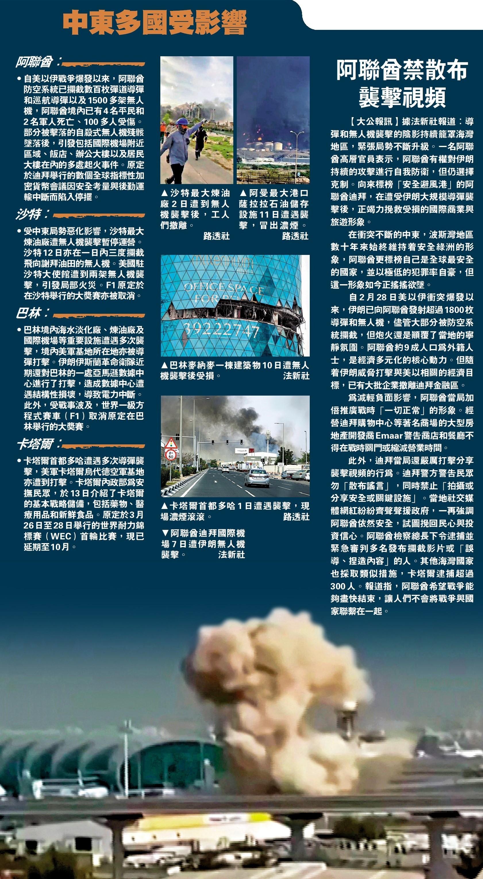 •自美以伊戰爭爆發以來,阿聯酋防空系統已攔截數百枚彈道導彈和巡航導彈以及1500多架無人機,阿聯酋境內已有4名平民和2名軍人死亡、100多人受傷。部分被擊落的自殺式無人機殘骸墜落後,引發包括國際機場附近區域、飯店、辦公大樓以及居民大樓在內的多處起火事件。原定於迪拜舉行的數個全球指標性加密貨幣會議因安全考量與後勤運輸中斷而陷入停擺。
