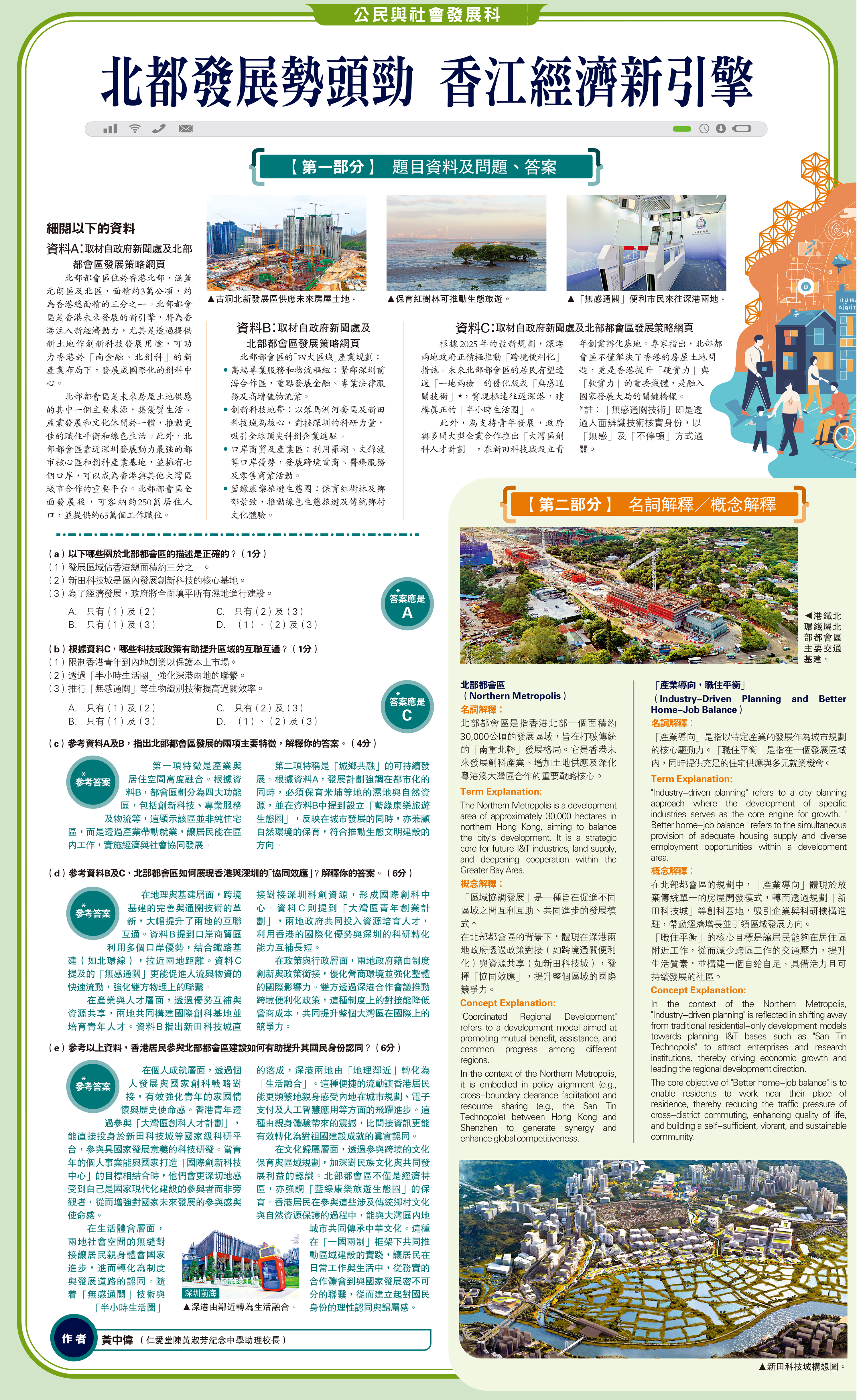 (d)參考資料B及C,北部都會區如何展現香港與深圳的「協同效應」?解釋你的答案。(6分)