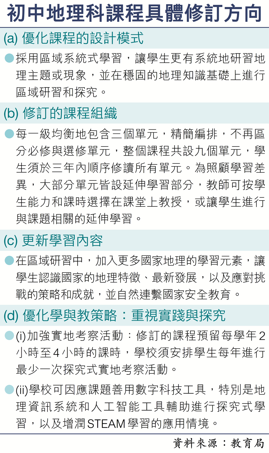 教育局表示,是次修訂主要涉及四大具體方向,包括優化課程設計模式、修訂課程組織、更新學習內容,及讓學與教策略更重視實踐與探究(見表)。