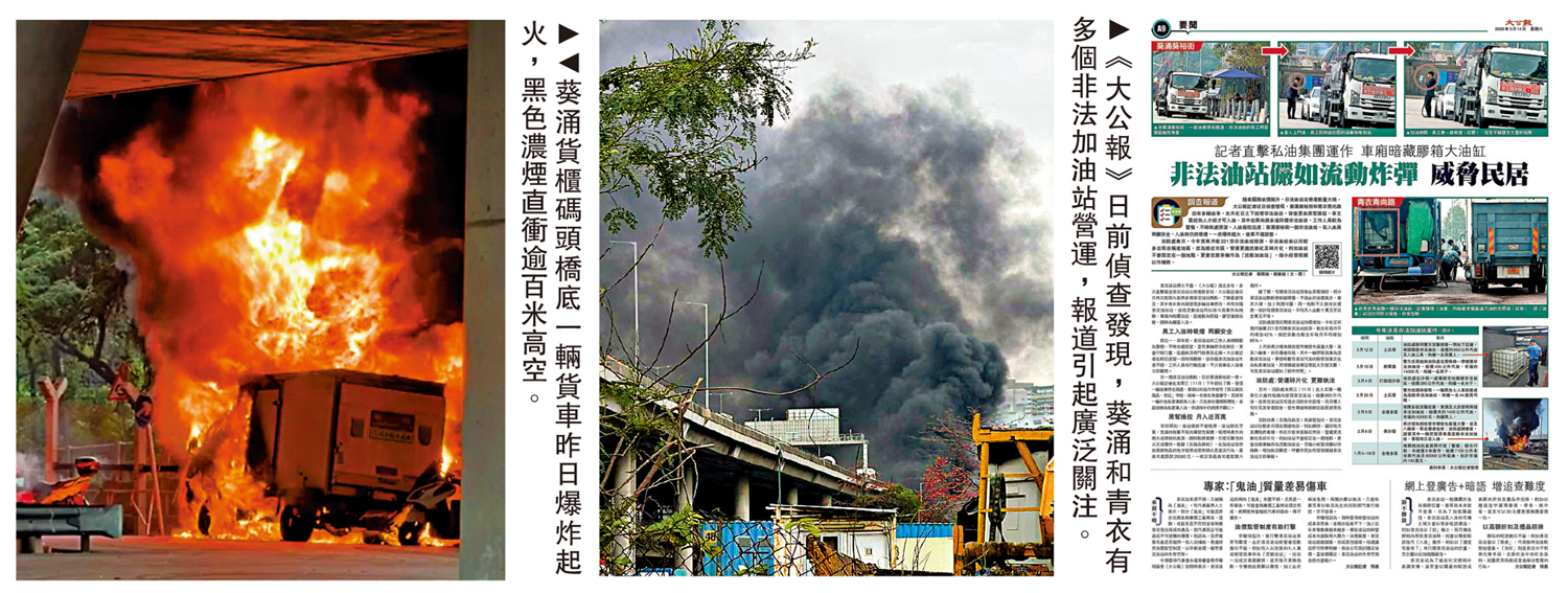 近年非法油站越發猖獗,消防處處長日前透露,今年首兩月已經接獲221宗相關投訴,比去年每月平均數字增加42%。大公報記者日前偵查發現,五檔懷疑三合會操控的非法油站分別位於葵涌和青衣。記者直擊葵涌葵裕街的一輛油車,在光天化日之下為私家車加油,其間有入油員罔顧安全,手持油槍時口叼香煙,不時有煙灰掉落,漠視點燃揮發性氣體的風險。