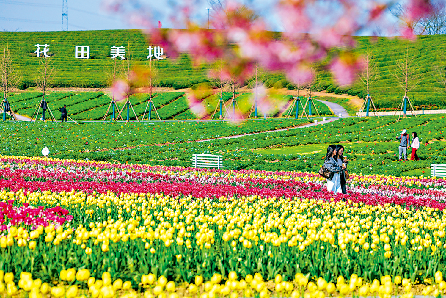 近日,浙江省金華市武義縣王宅鎮的花田美地景區花海進入盛花期,金黃色的油菜花與粉色櫻花、多彩鬱金香等共同構成春日美麗畫卷,吸引遊客前來打卡遊玩。\新華社