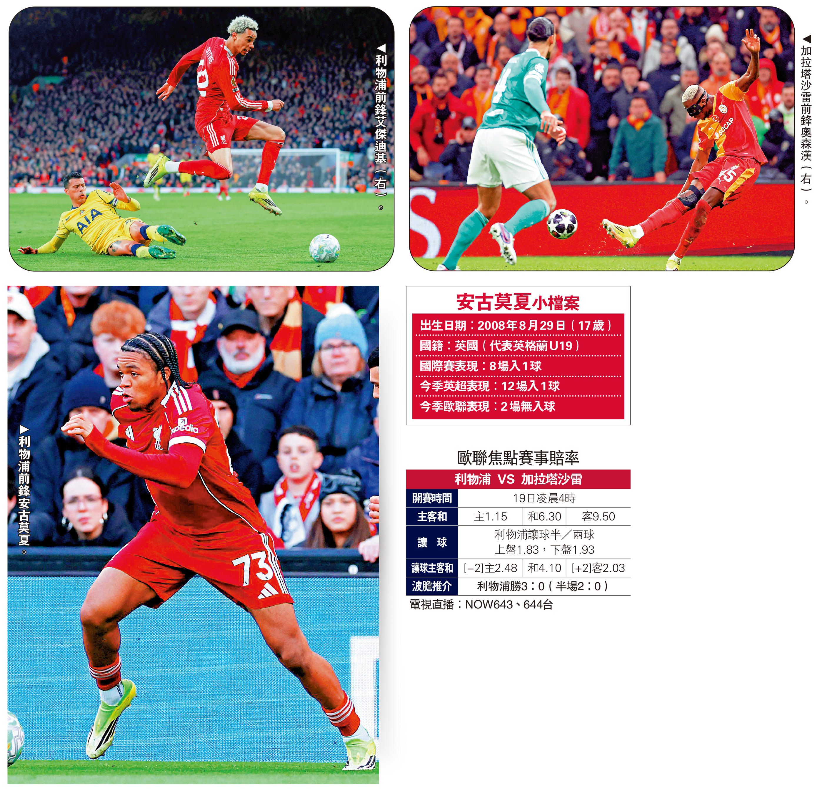 說回歐聯16強,利物浦在首回合以0:1輸給加拉塔沙雷,次回合重返晏菲路球場,最起碼要取得入球才有望晉級8強。預計前鋒艾傑迪基會重返正選之列,與沙拿及華迪斯合組「進攻三叉戟」。假如加拉塔沙雷死守力保領先局面,而艾傑迪基等未能打破缺口的話,盤球突破力強大的安古莫夏此時正可大派用場。