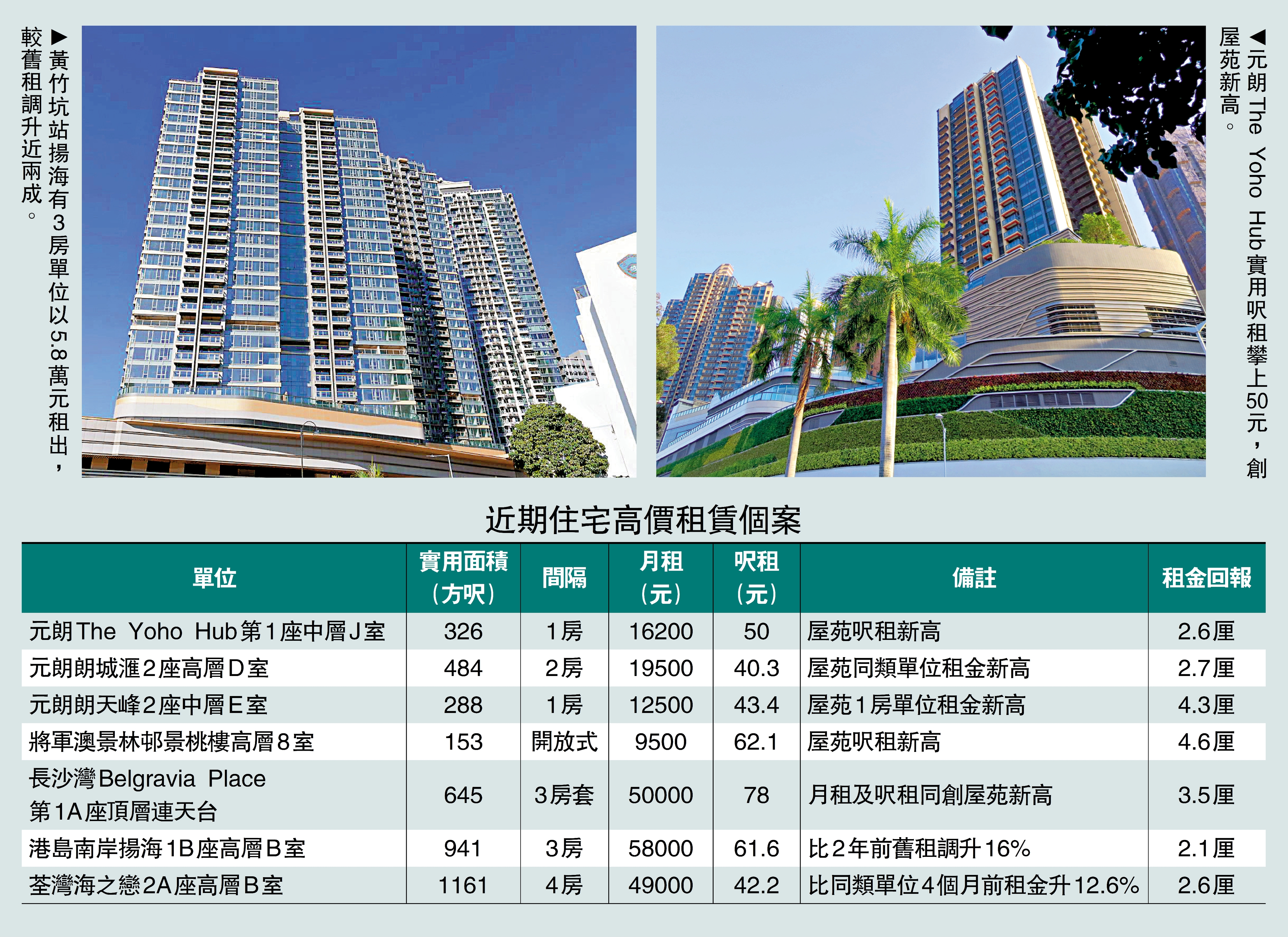 專才及留學生持續湧港,帶旺住宅租賃需求,新晉屋苑租金造好,黃竹坑揚海有3房單位以5.8萬元租出,較舊租調升16%;元朗上車盤亦不遜色,The Yoho Hub有1房單位呎租撲50元,破盡屋苑入伙逾3年紀錄;西環寶翠園租金不足半年急升11.4%。租務市場全面升溫,多個屋苑錄得租金新高。\大公報記者 林惠芳