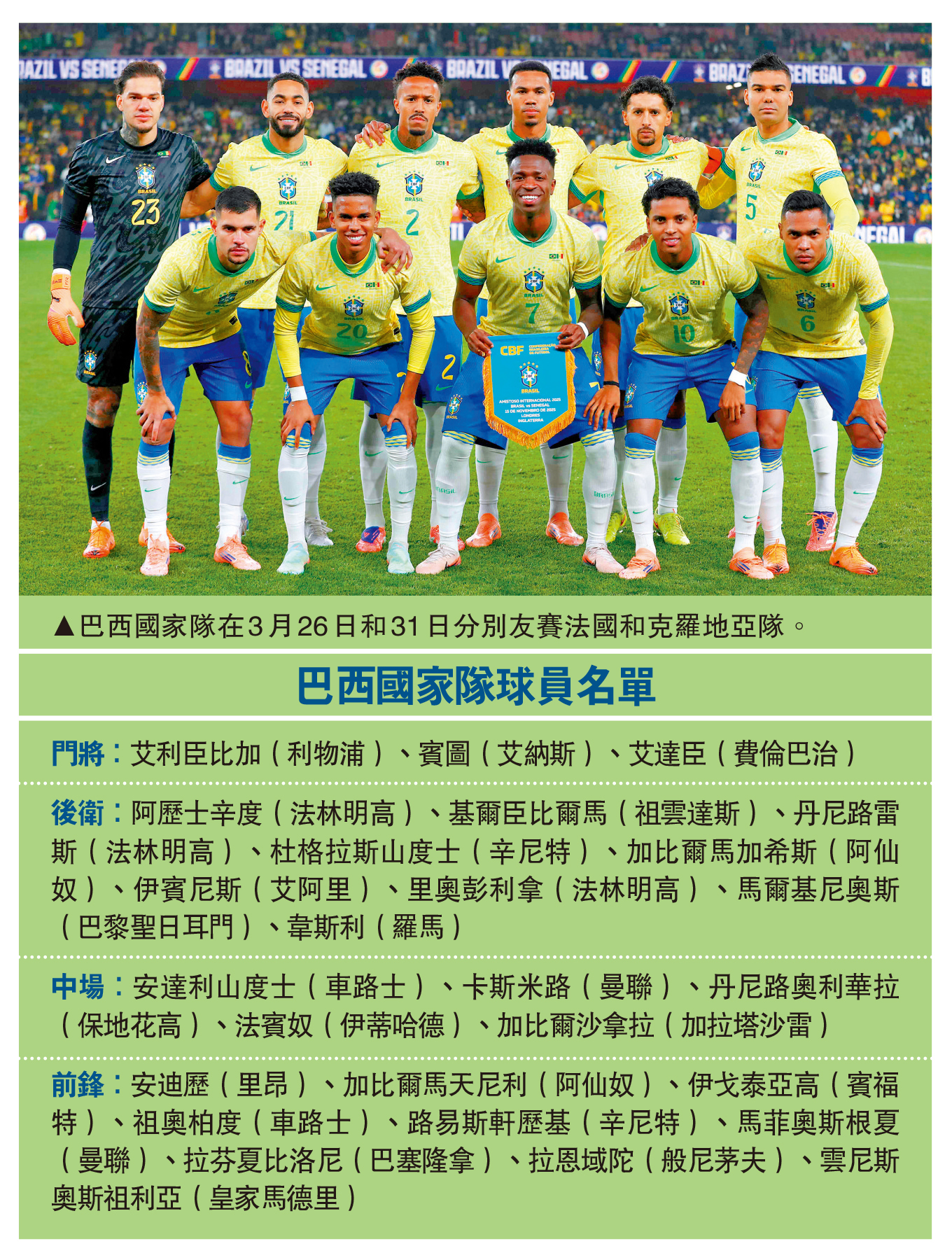 【大公報訊】據新華社報道:巴西男足國家隊主教練安察洛堤16日公布了巴西隊參加本月26日和31日與法國和克羅地亞隊友誼賽的球員名單。這是巴西國家隊在2026年世界盃最終名單公布前的最後一次徵召,尼馬依然未能入選。