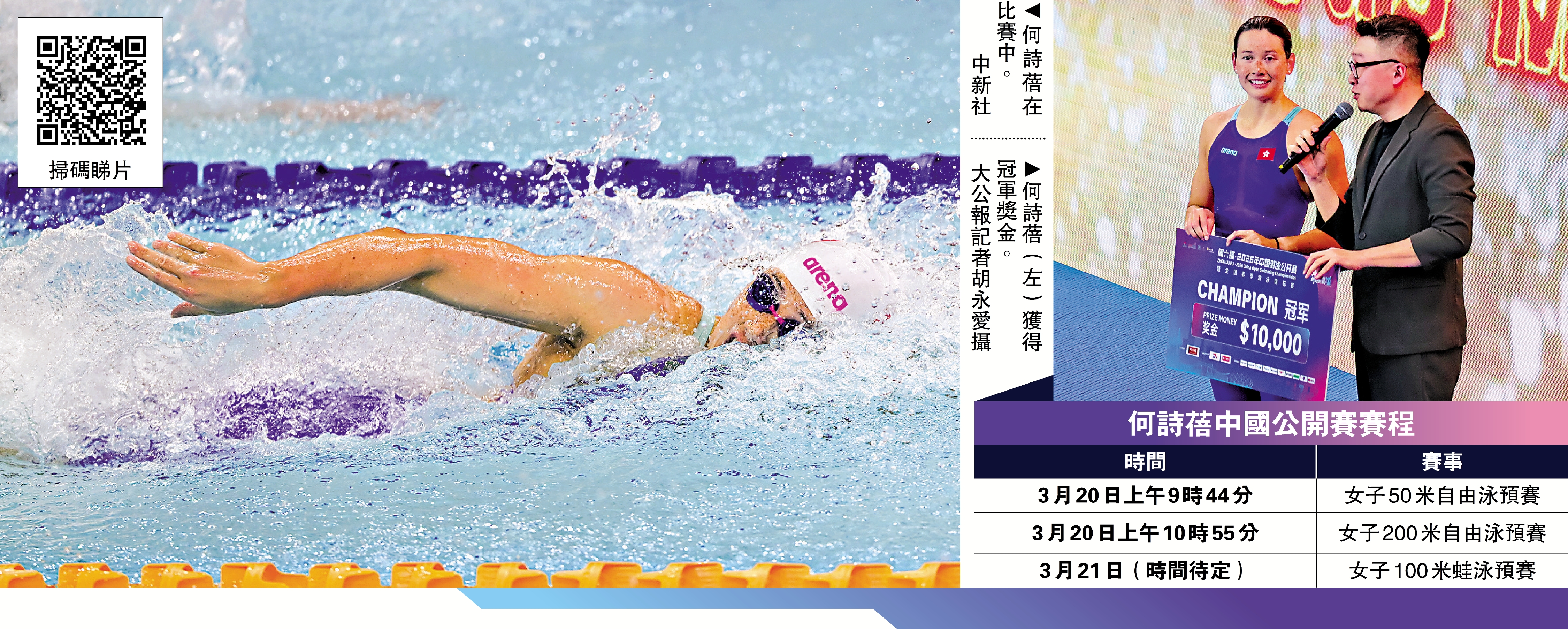 2026年中國游泳公開賽暨全國春季游泳錦標賽19日在深圳大運中心游泳館揭開戰幔。中國香港名將何詩蓓首天在主項女子100米自由泳決賽游出52秒79,以0.01秒力壓澳洲好手奧卡拉漢,奪得金牌。這是何詩蓓相隔不足半年,繼去年底第15屆全運會後,再次在同一場館站上頒獎台最高位置。\大公報記者 胡永愛、李薇深圳報道