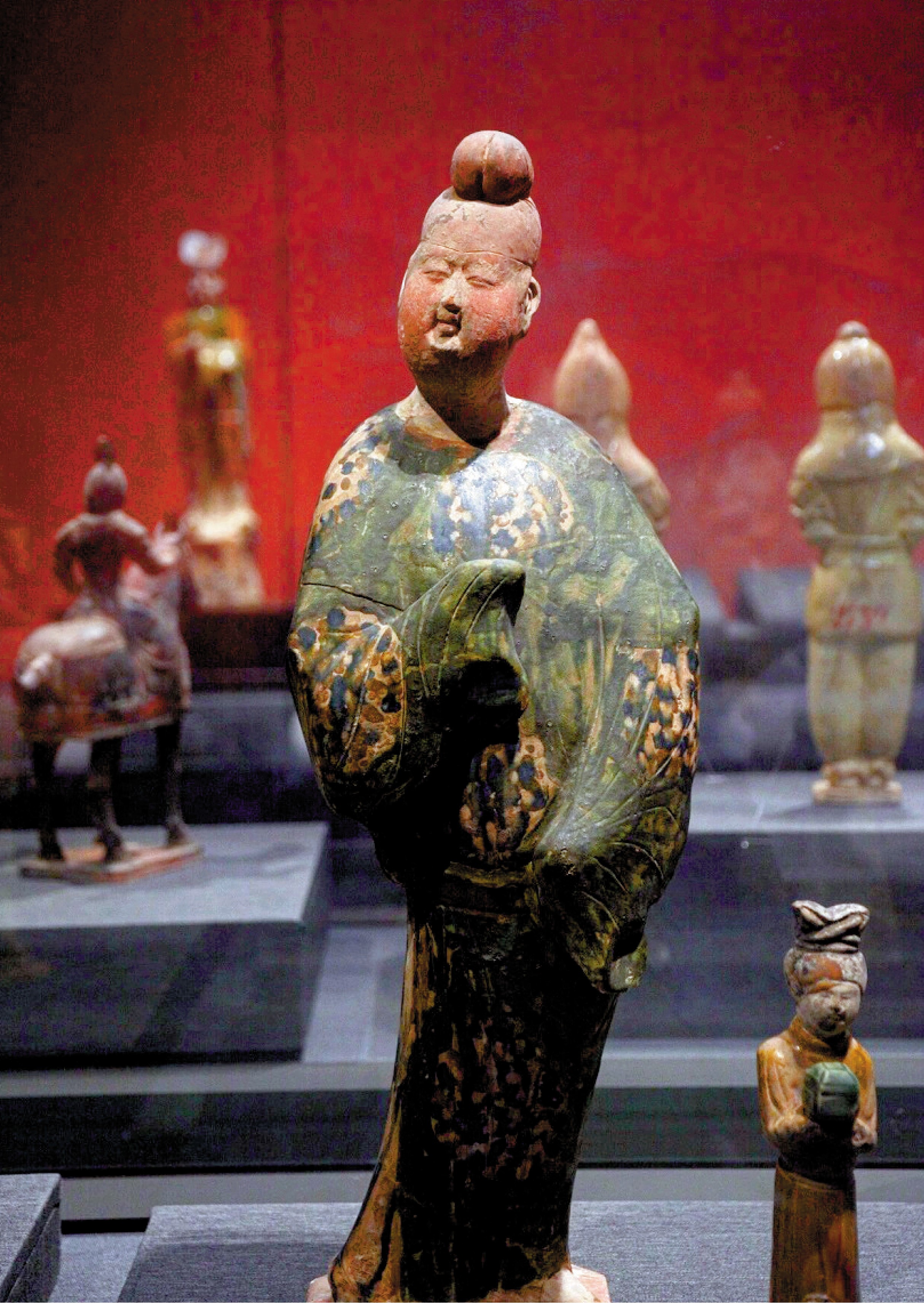 這件三彩女俑身份似是一位女官,俏麗中顯出瀟灑英俊的風度。唐三彩採用黃、綠、白等多色釉料,經低溫燒製,釉料流動形成獨特的斑駁效果。這件俑身着綠袍,釉色歷經千年依然鮮亮。