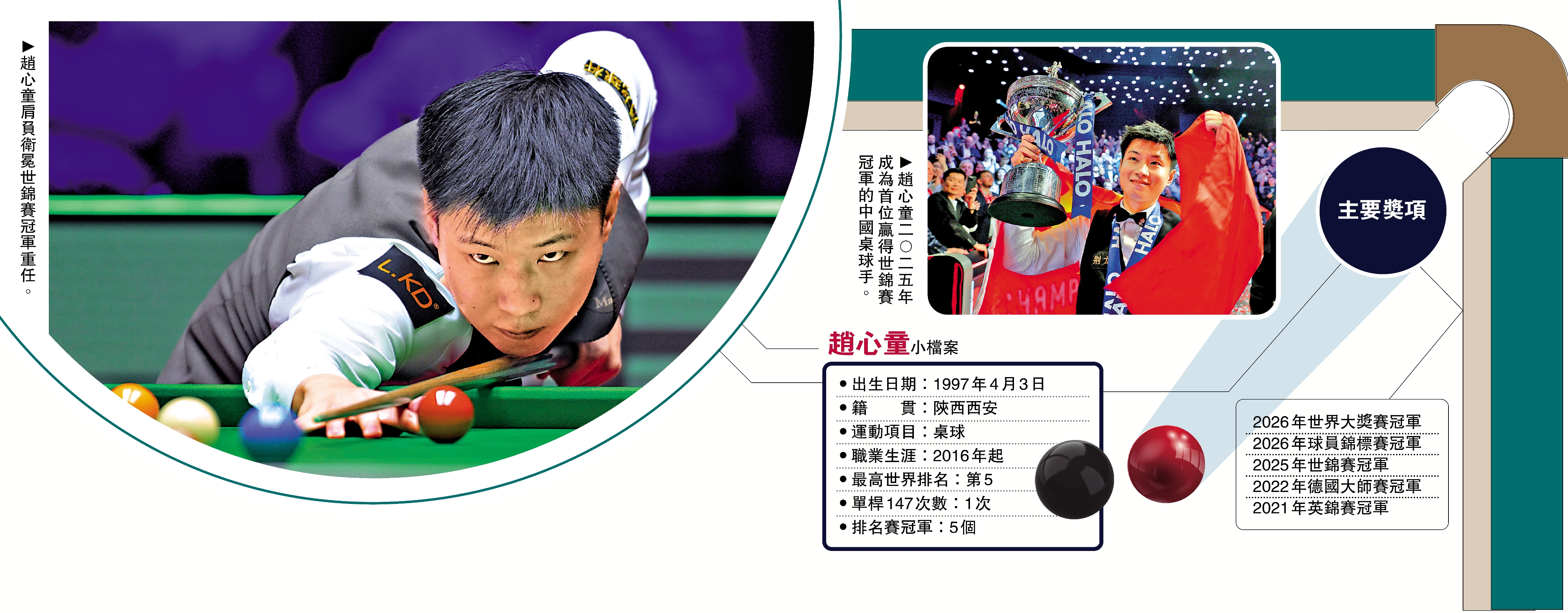 2月中,趙心童轉戰球員錦標賽,這個只邀請當季排名最高16名球員參與的賽事,他打出極富含金量的比賽,在首圈擊敗英格蘭的施利沙,8強勝另一英格蘭球手梅菲,4強挫北愛爾蘭名將艾倫,決賽贏蘇格蘭老將希堅斯,成為首個在這項賽事奪冠的中國球員。以他目前的巔峰狀態,確實有力衛冕世界冠軍。