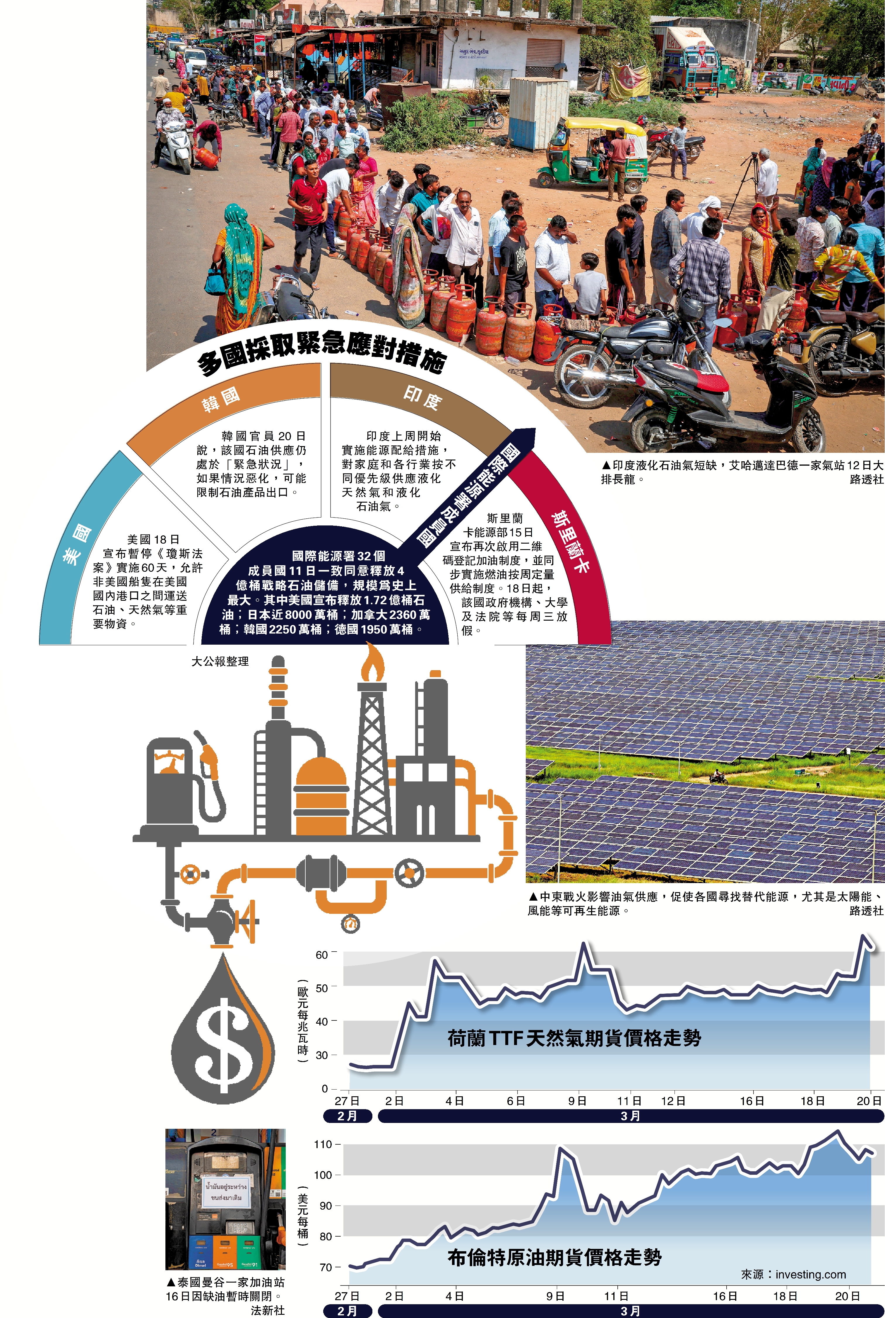 美國和以色列對伊朗開戰滿三周,導致全球關鍵能源和物資運輸通道霍爾木茲海峽「梗阻」、多地油氣設施遇襲,石油和天然氣價格飆升。多國被中東戰火負面外溢效應波及,能源供應不穩,緊急採取釋放石油儲備、限制能源價格、能源配給等措施。國際能源署(IEA)20日提出居家辦公、避免搭乘飛機出行等節能建議。這場危機亦促使各國重審能源政策,尋求加快能源轉型或實現能源供應多元化。\大公報記者 郭嘉