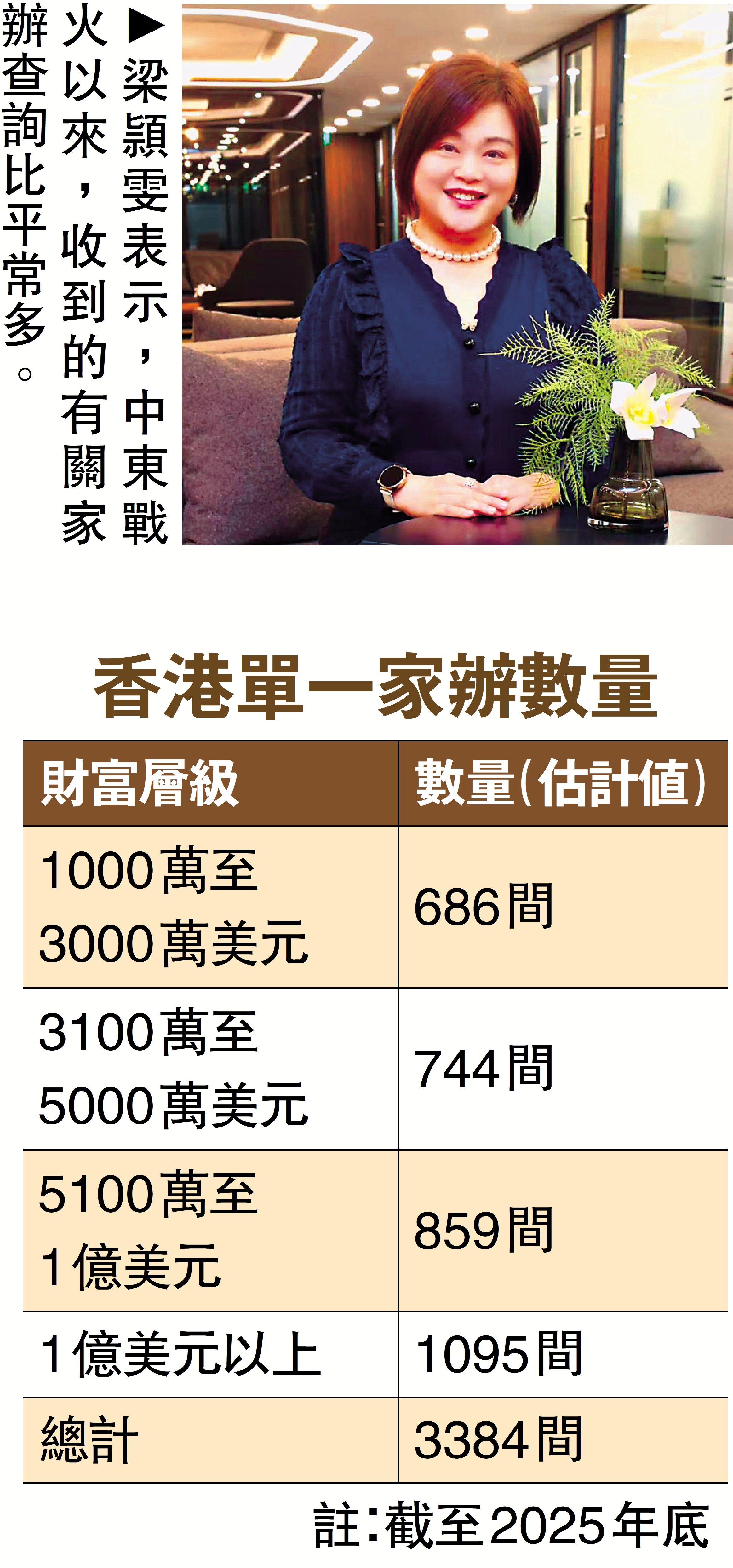 中東局勢持續緊張,區內家族辦公室(下稱「家辦」)或考慮撤至其他金融樞紐。上駿信託董事總經理梁頴雯告訴《大公報》記者,中東戰火燃起至今,收到的查詢比平常多,主要有關在香港設立家族信託事務,同時注意到個別客戶有興趣將資產重新部署至亞洲其他地區,香港受惠更加安全穩定的地緣政治環境,有望成為許多家族的優先選項。