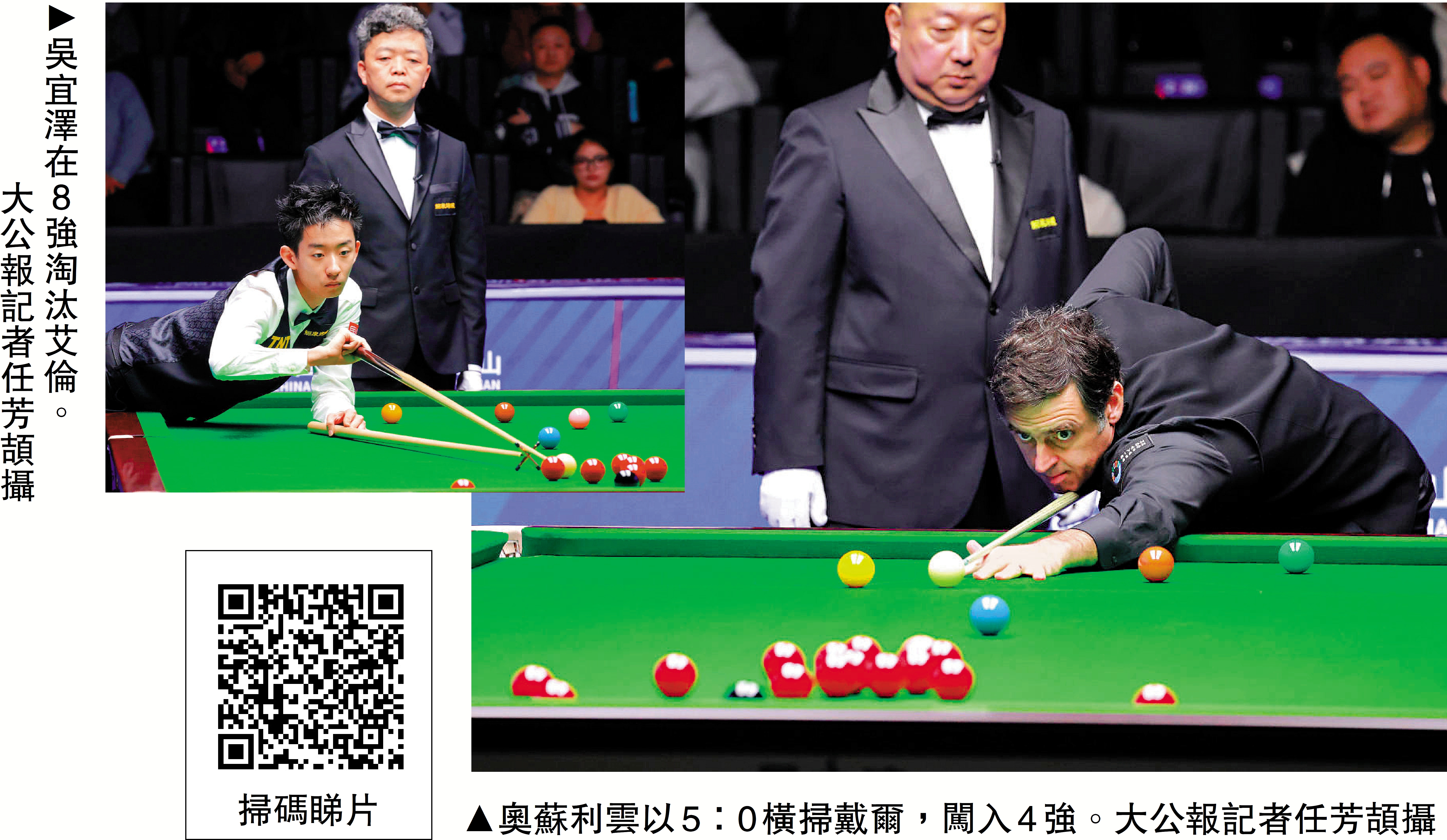 【大公報訊】記者任芳頡江西報道:2026桌球世界公開賽20日在江西玉山展開8強激鬥,「火箭」奧蘇利雲在比賽中轟出單桿153分刷新正式比賽單桿紀錄,以5:0橫掃戴爾晉級4強。中國小將吳宜澤在另一場8強比賽中延續火熱狀態,以5:1橫掃艾倫。吳宜澤晉級後,將與奧蘇利雲在21日的4強戰正面交鋒,爭奪決賽門票。