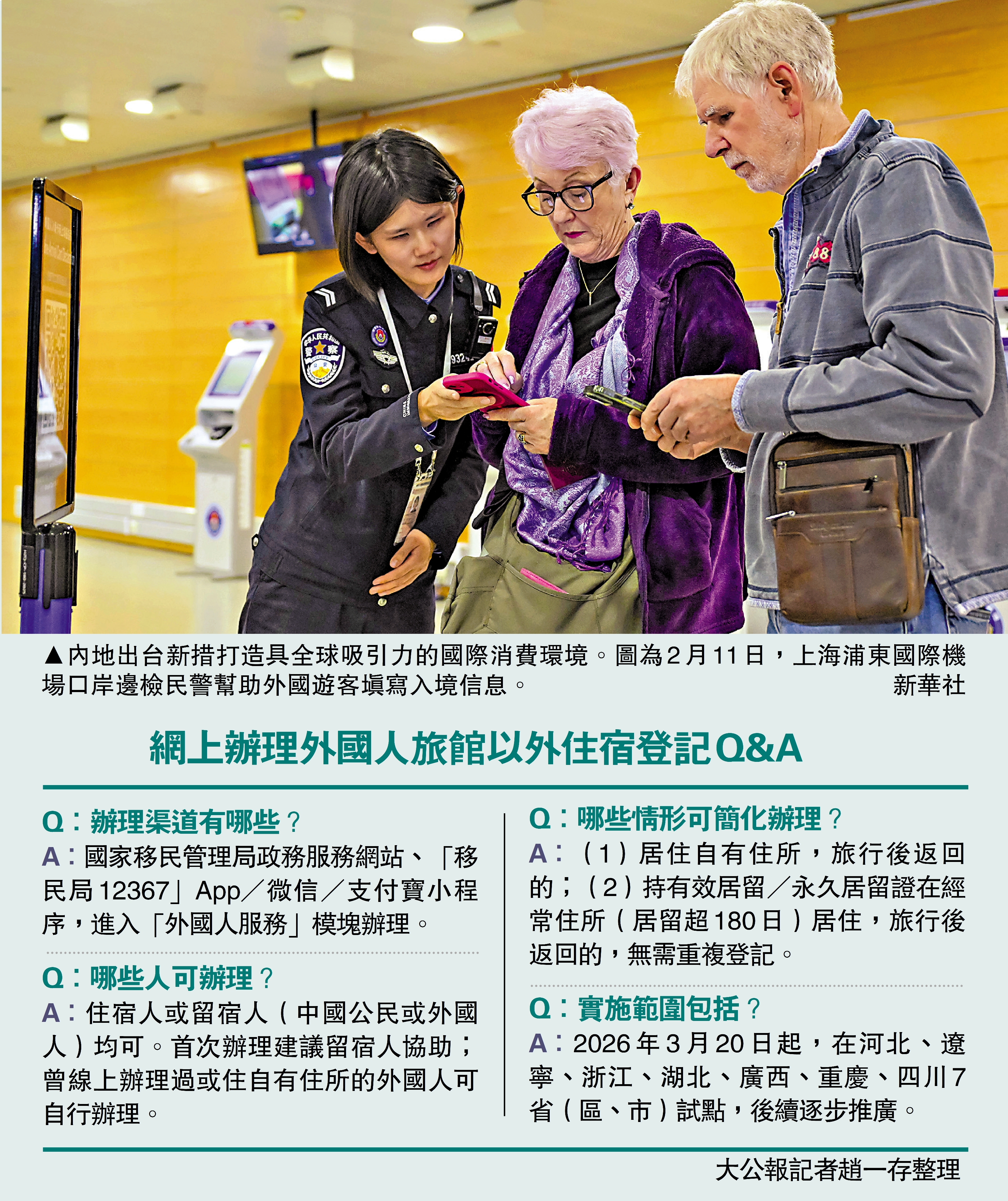 同日,國家移民管理局宣布在7省市試點推行外國人旅館以外住宿登記網上辦理,以提升在華生活便利度。業內分析認為,此舉不僅將吸引更多外國人來華旅遊,還將進一步優化中國的國際營商環境,吸引更多外籍人才來華工作、學習。\大公報記者 趙一存北京報道