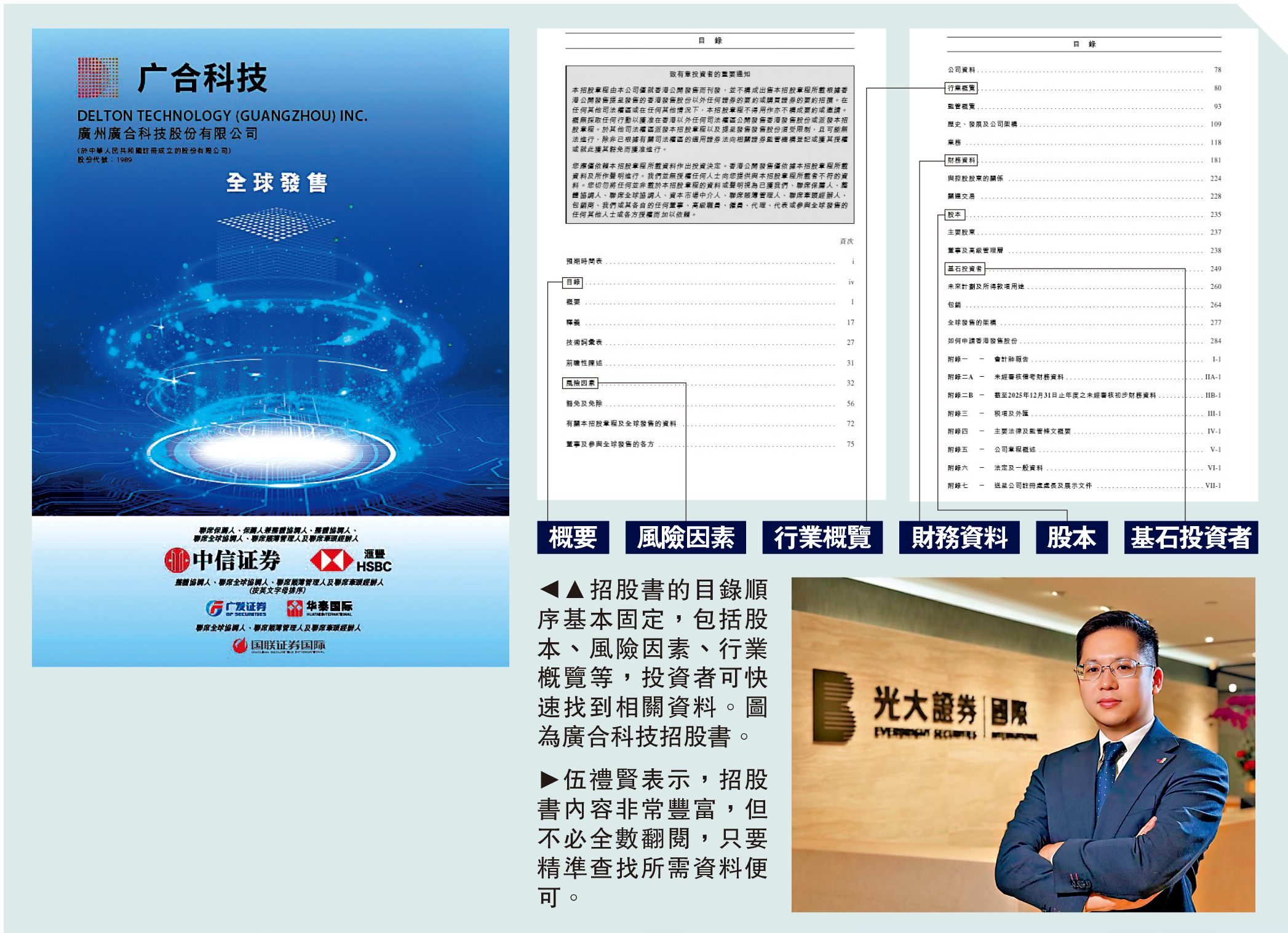 招股書組成結構主要包括:概要、風險因素、行業概覽、財務資料、股本、主要股東、基石投資者、未來發展計劃及募集所得款項用途、全球發售的架構等板塊。伍禮賢提醒,招股書的目錄順序基本是固定的,可以藉此快速入手。