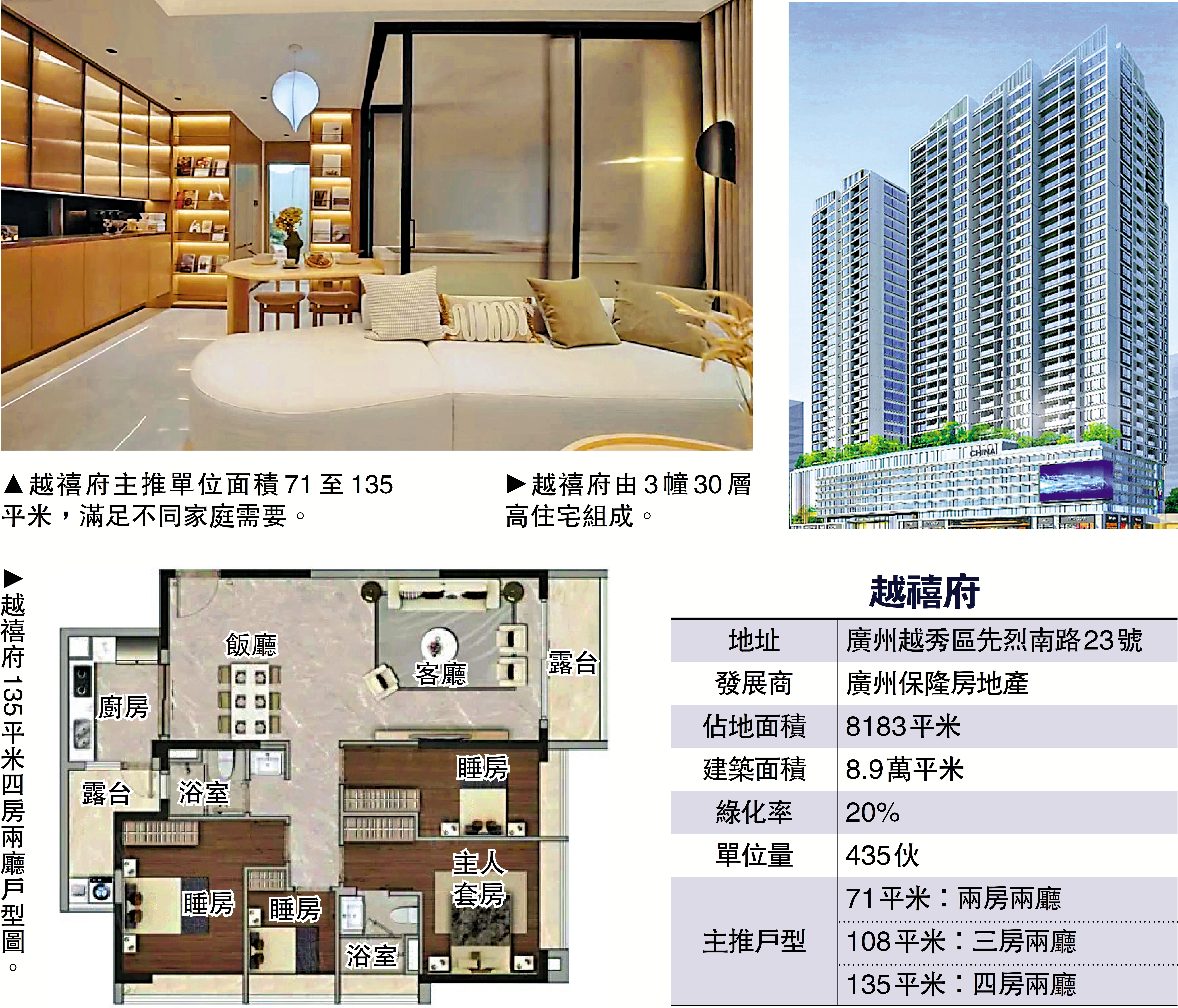 越禧府主推面積71至135平米的兩房至四房單位,滿足不同家庭需要,交付標準包括全屋智能化和大金中央空調等配置,實現拎包入住。其中,71平米兩房兩廳戶型,四開間望白雲山,配備德系廚電;108平米三房兩廳戶型,三開間朝南,大廳面積約45平米,觀景露台闊4.2米,主人套房面積超17平米,贈送定製化衣櫃;135平米四房兩廳戶型,三開間朝南,客廳空間約50平米,望向公園美景,贈送面積多,實用率高。