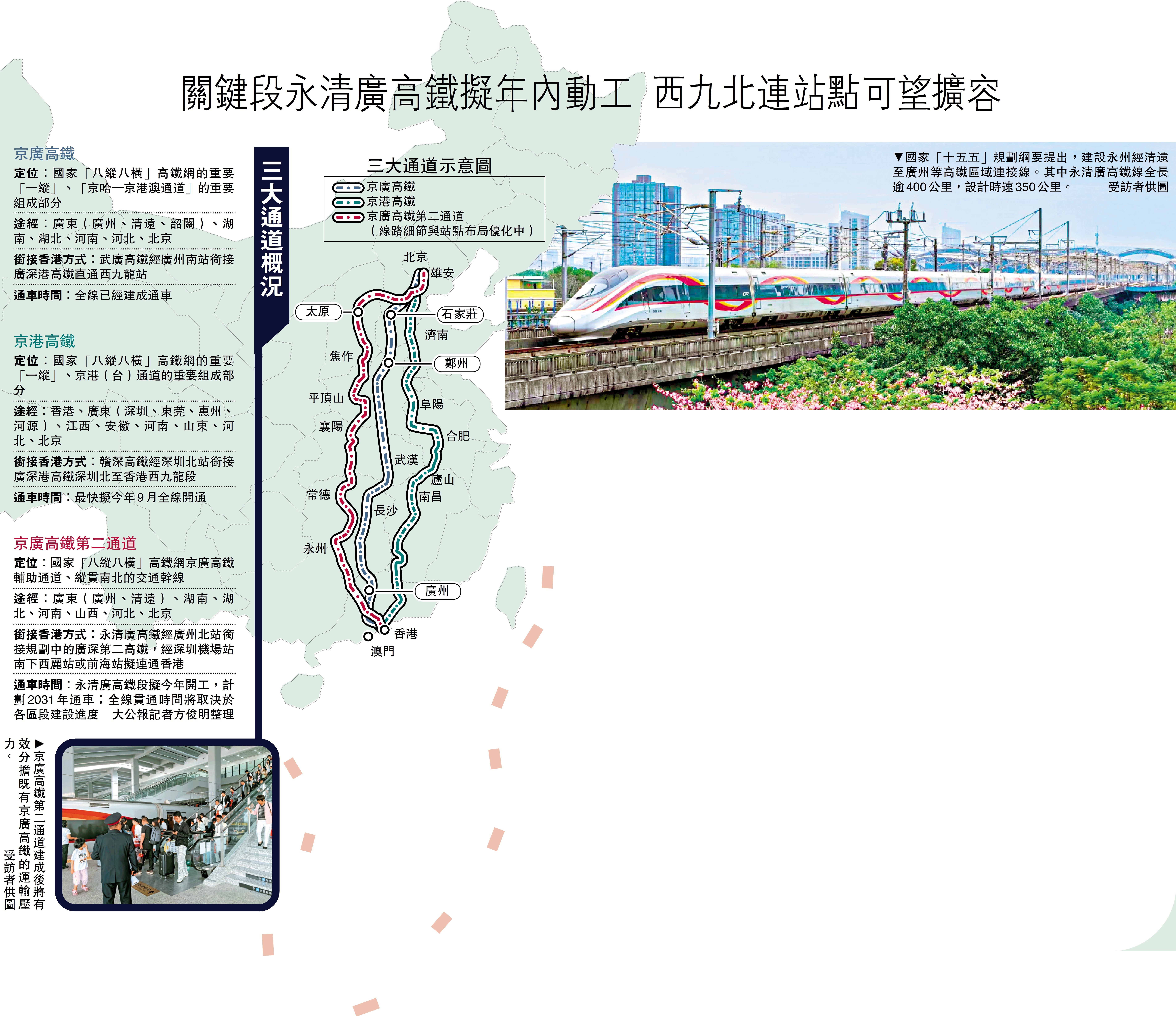 作為構建國家「八縱八橫」高鐵網京廣第二通道的關鍵段,永清廣高鐵項目已被列入今年廣東省政府工作報告,提出年內開工建設。這意味着京廣高鐵第二通道呼之欲出,建成後將有效分擔既有京廣高鐵的運輸壓力,進一步強化粵港澳大灣區北上高鐵「大動脈」能力,並將與京廣高鐵、京港高鐵共同構成香港通往內地的三條南北向高鐵大通道。\大公報記者 方俊明廣州報道