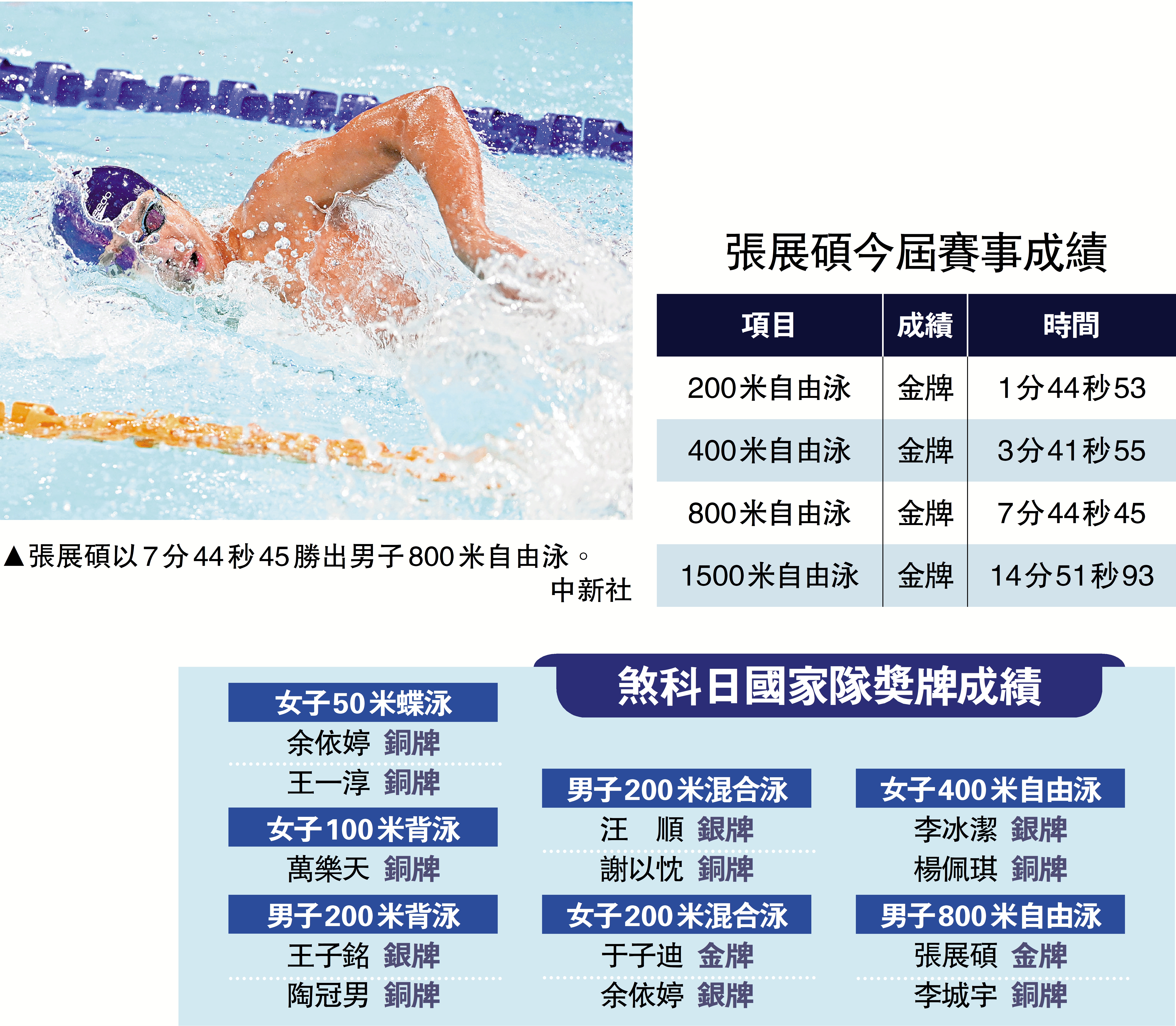 【大公報訊】據新華網報道:21日,張展碩在中國游泳公開賽男子400米自由泳比賽中以3分41秒55的成績摘得金牌,並刷新個人最好成績。